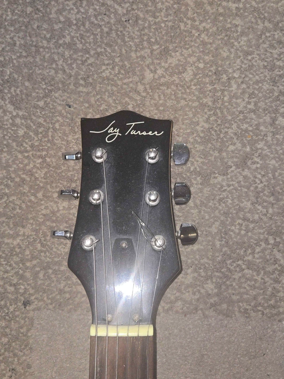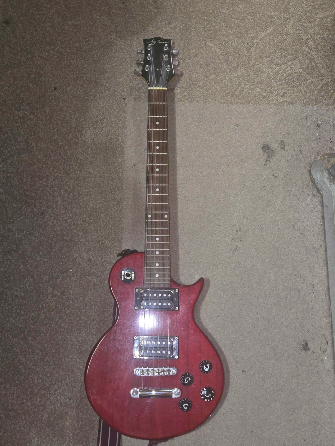 This is a red electric guitar from Jay Turser. It's a solid body guitar with a classic design. It has two pickups and standard volume and tone controls.