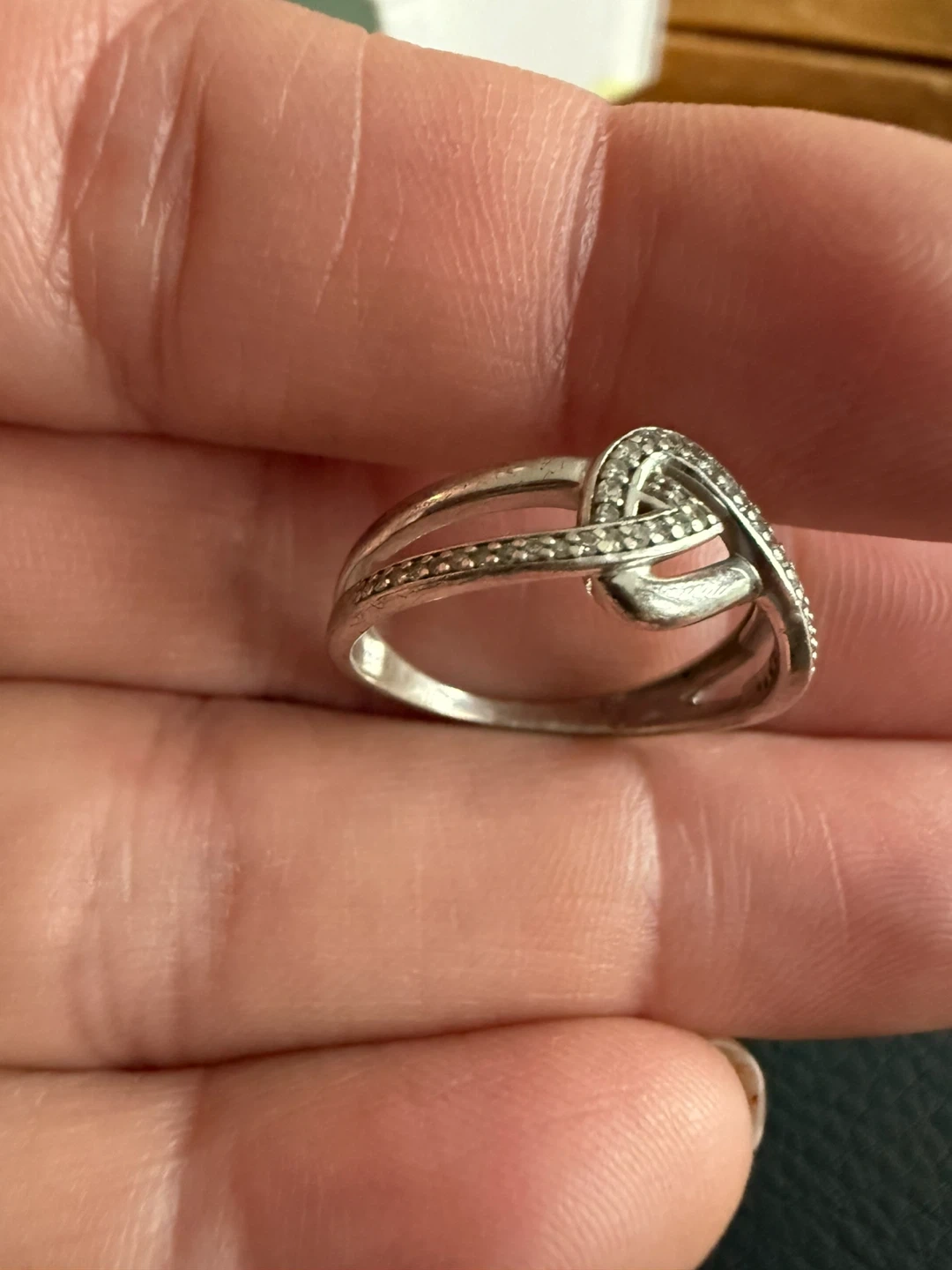 Got rid of the boyfriend now it’s time to get rid of the gifts. This sterling silver ring features a stylish infinity knot design encrusted with small cubic zirconia stones. It's a beautiful piece for everyday wear or as a thoughtful gift. This ring offers a touch of sparkle to any outfit!