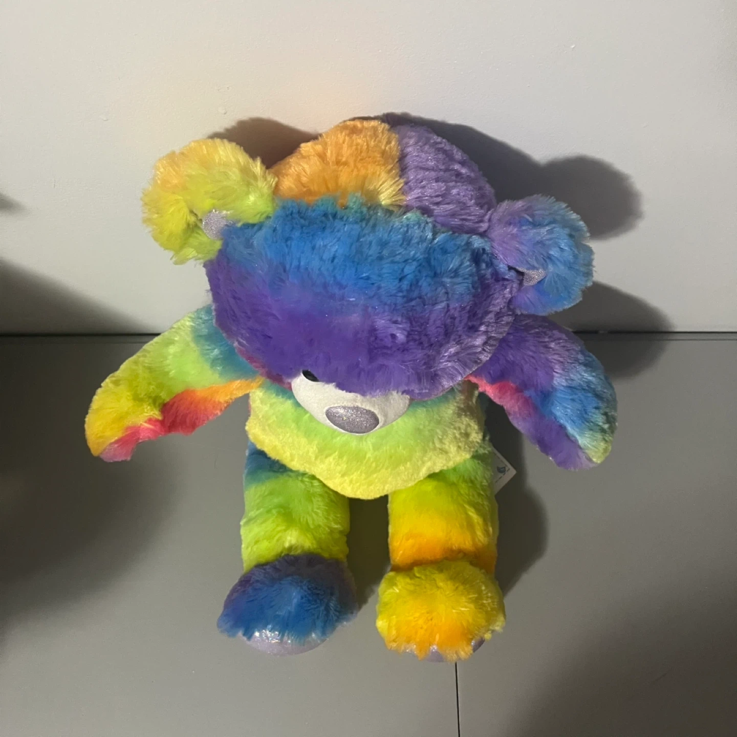This rainbow tie-dye teddy bear plush toy is super soft and cuddly! It's got sparkly paws and ears for a touch of magic. This bear's colourful design makes it a fun companion for kids of all ages.