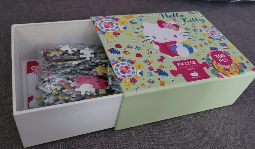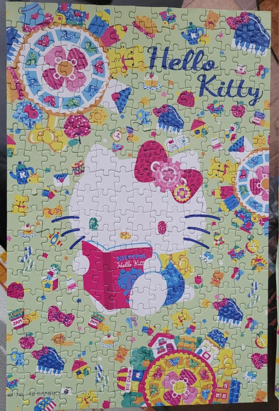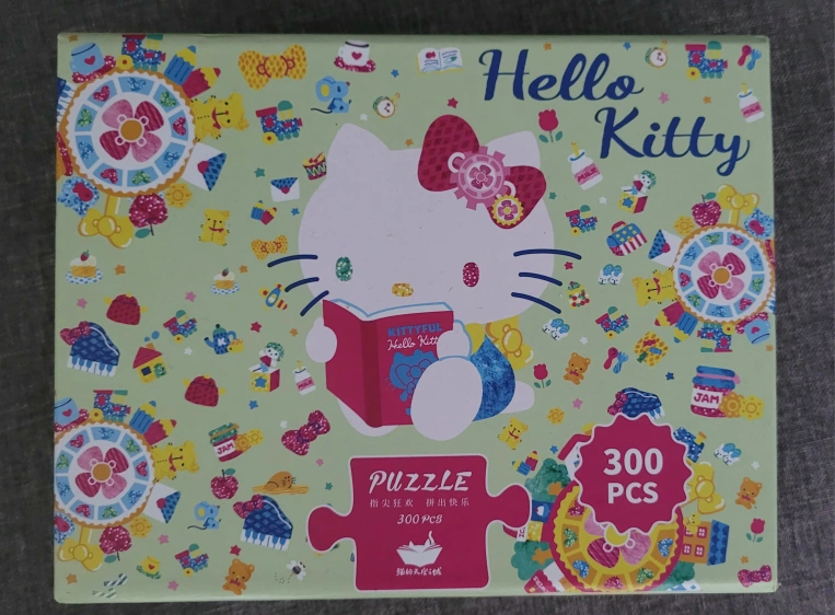 300-piece jigsaw puzzle. Features Hello Kitty reading a book. Pastel colours. Comes in a box. Great for puzzle lovers.