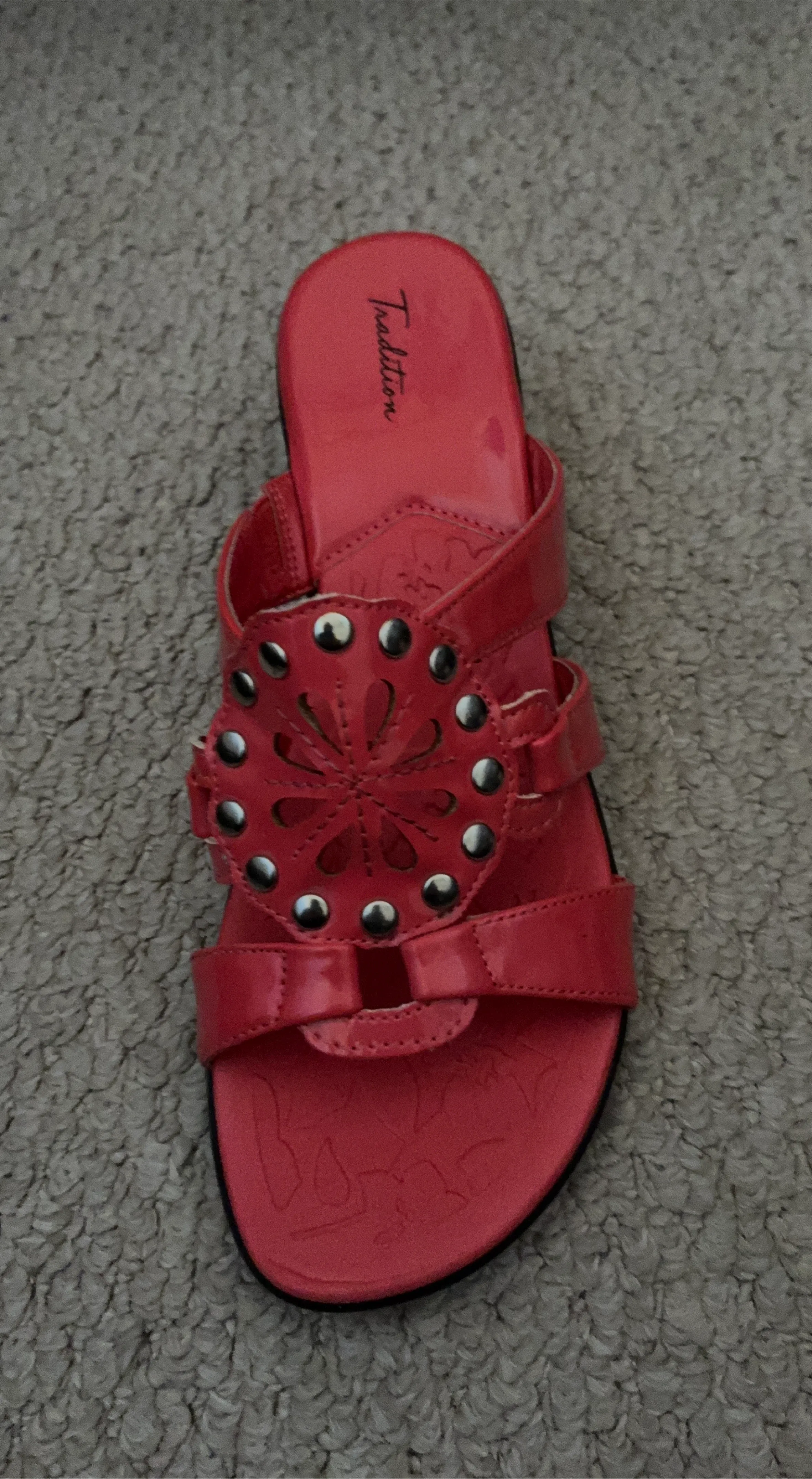 These orange sandals feature a decorative flower design with silver studs. They appear to be made of a patent material. Suitable for warm weather.
