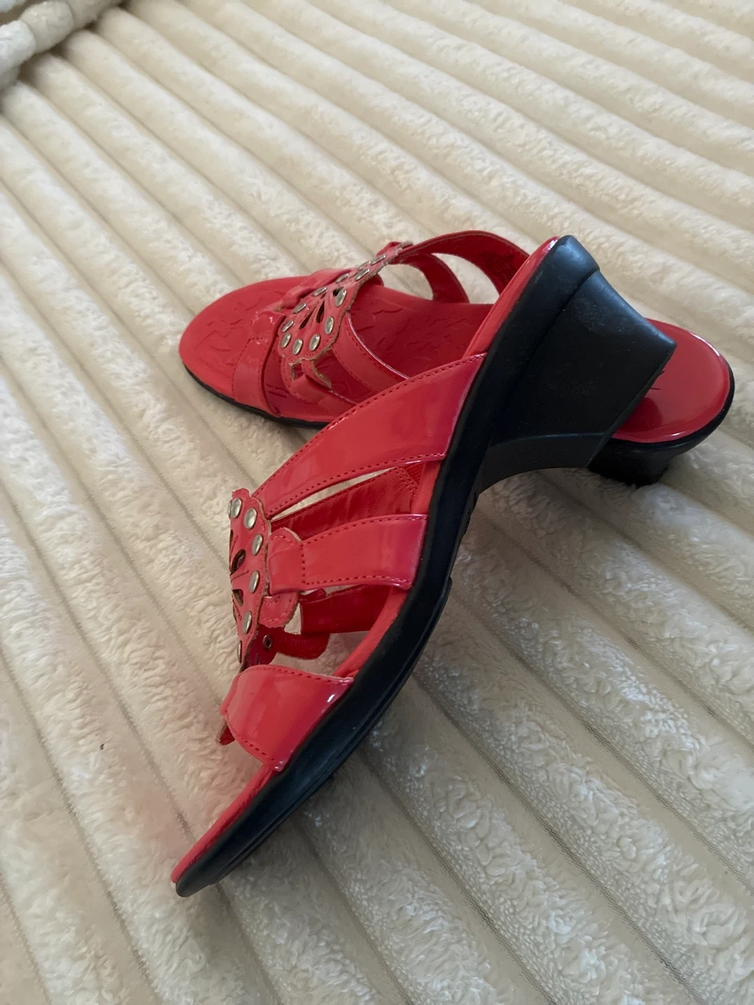 These orange sandals feature a decorative flower design with silver studs. They appear to be made of a patent material. Suitable for warm weather.