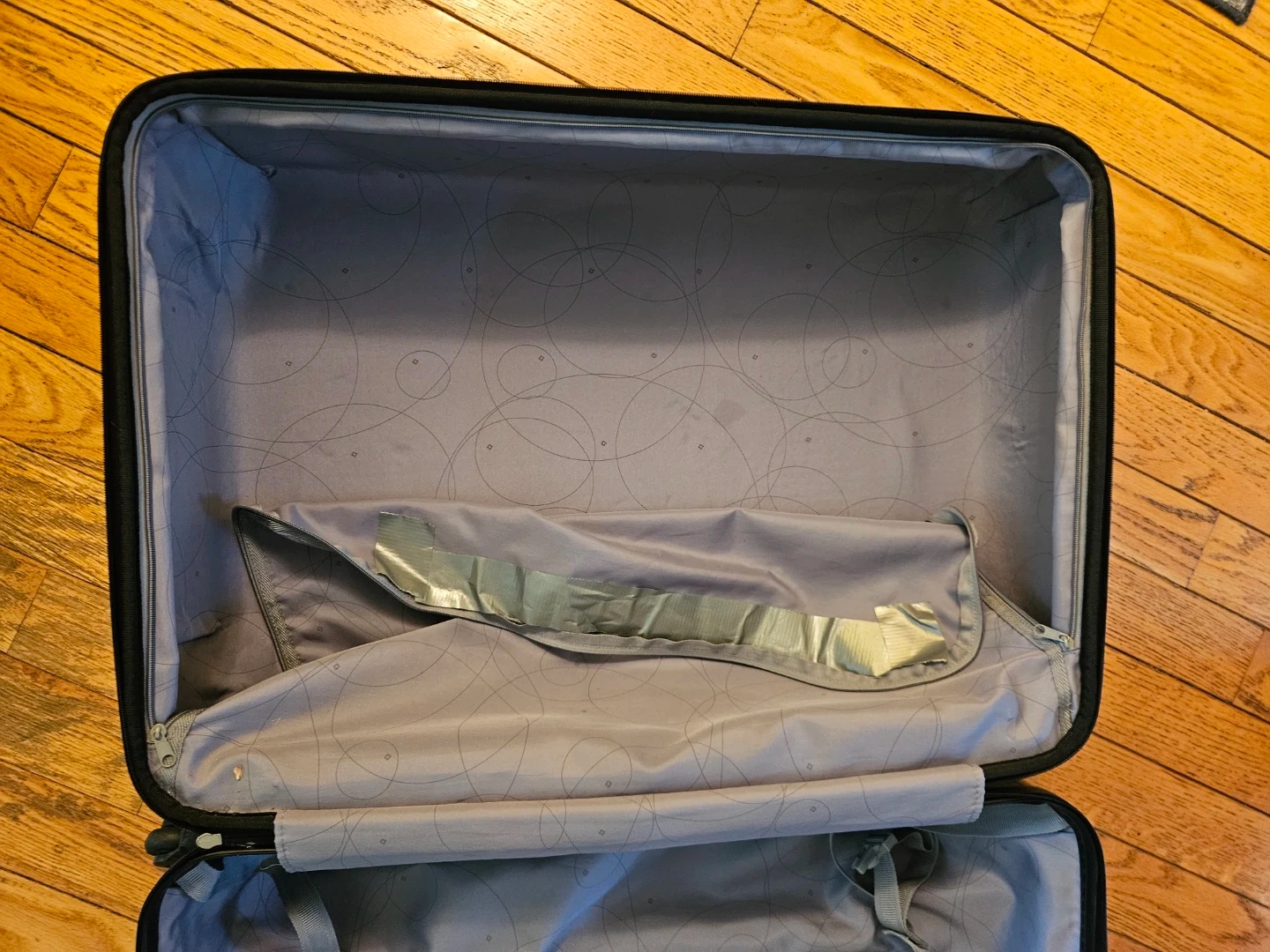 This is a Samsonite hard-shell suitcase. It has a patterned exterior and a fabric interior with tie-down straps. It is large and suitable only for checked baggage. Approx 12 x 19 x 30in