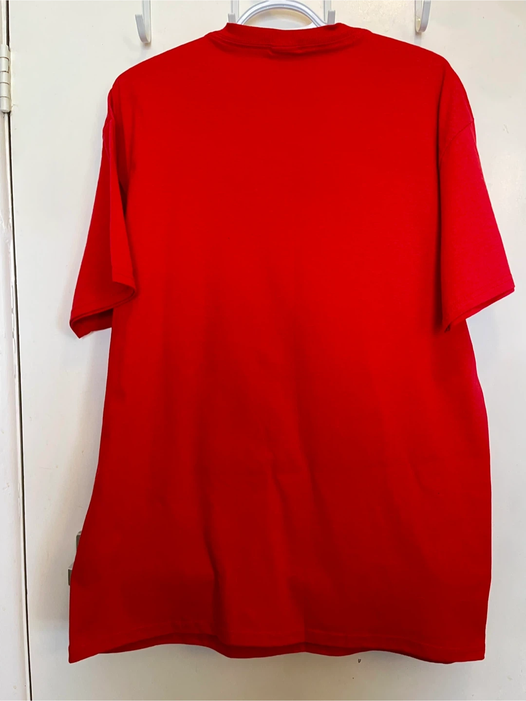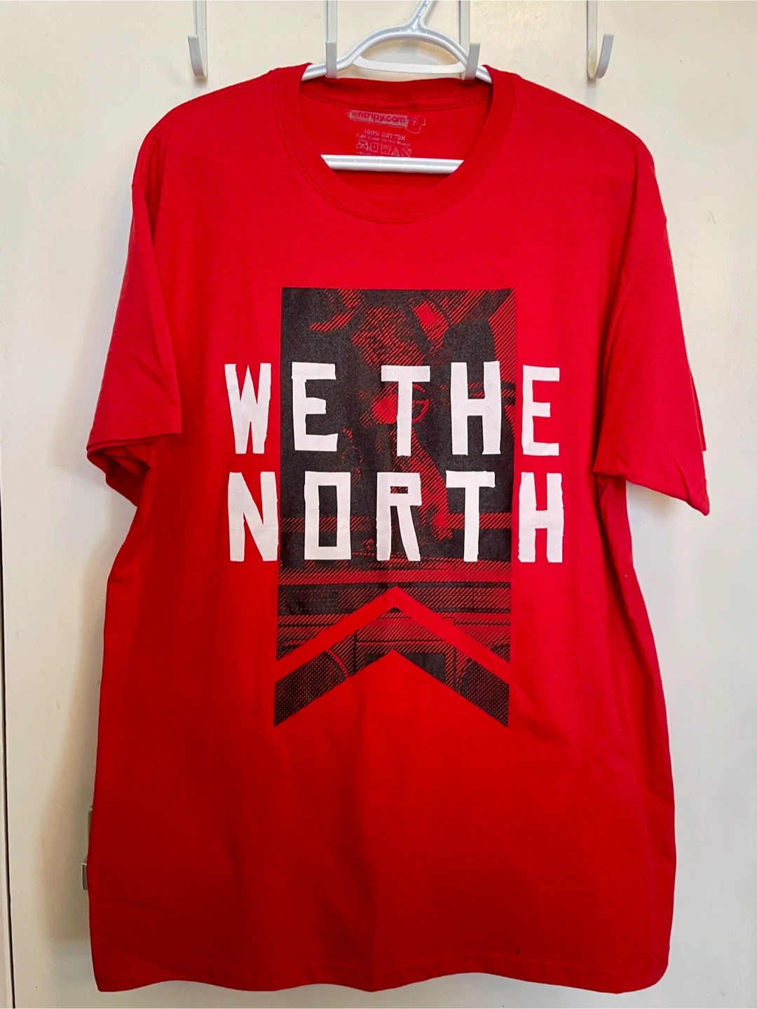 This is a new, never worn red Entripy Toronto Raptor t-shirt featuring the "We The North" slogan. It's made of 100% cotton and is size large. Printed in Oakville, Ontario.