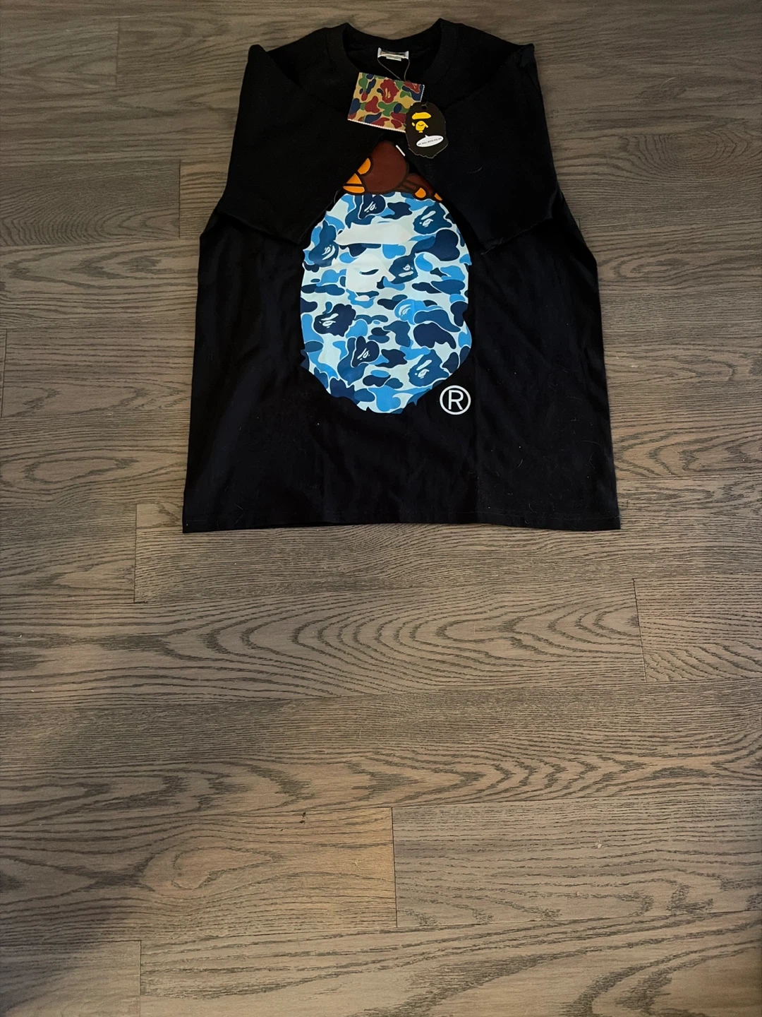 A Bathing Ape black t-shirt featuring the signature blue camo print. It's a size small. This tee comes with its original tags attached.