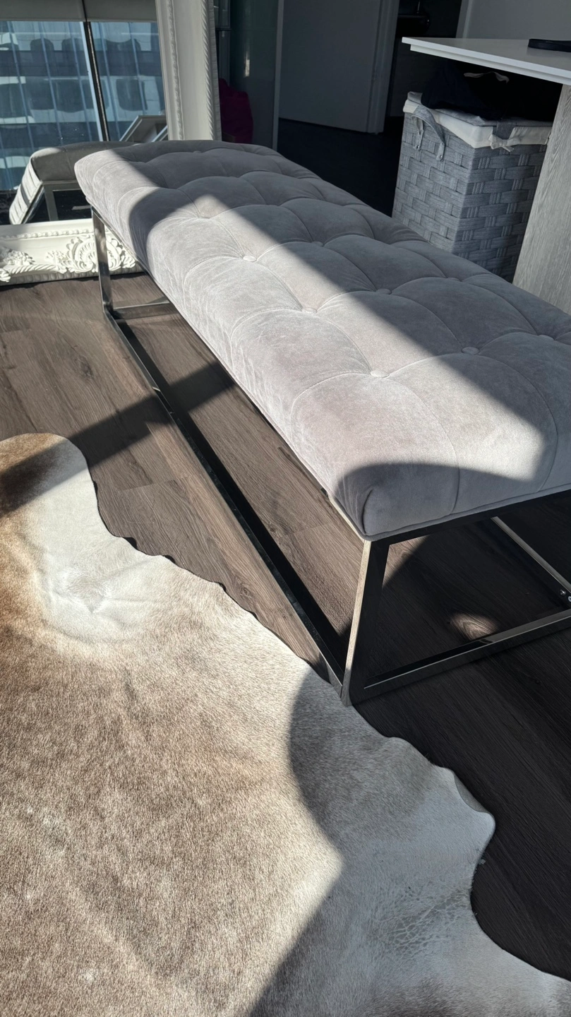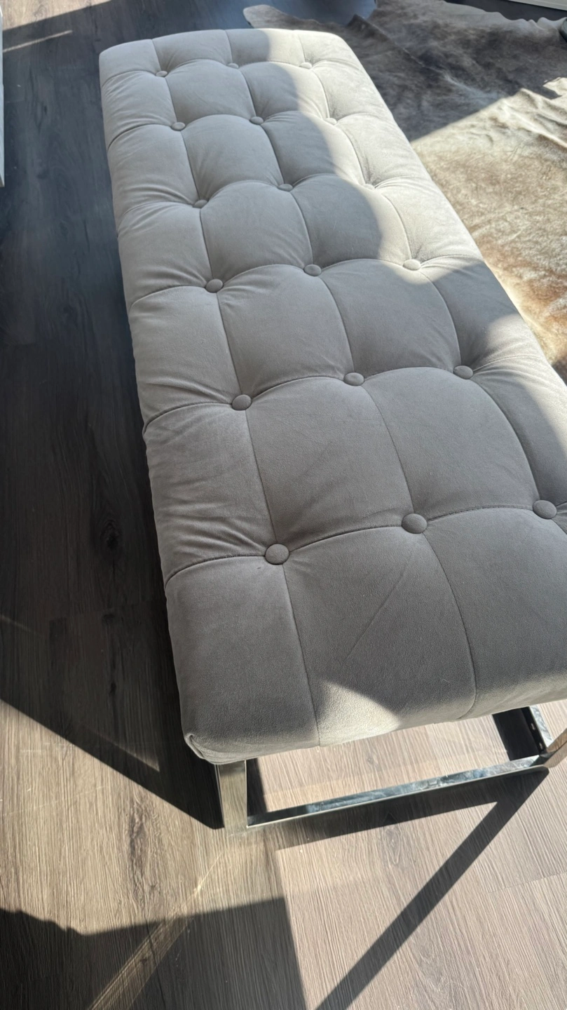 Stylish grey velvet bench. Features a button-tufted design and sleek metal legs. Perfect for entryway or bedroom. Modern design.