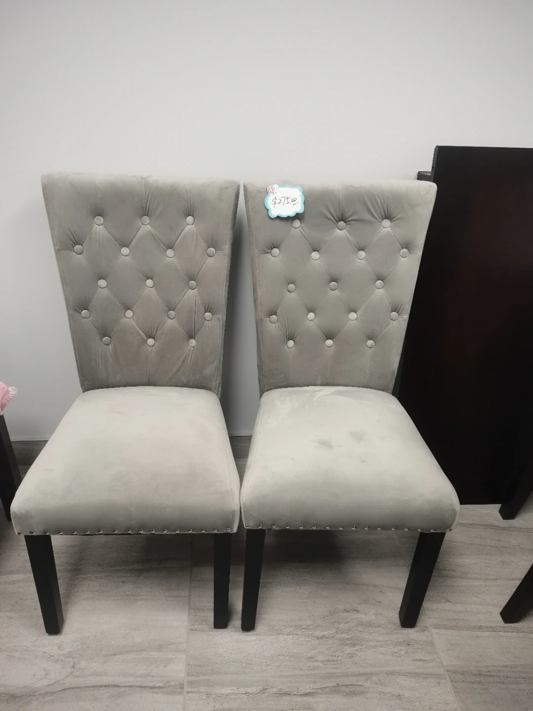 Add a touch of elegance to your dining area with these lovely grey velvet chairs! These used chairs each measure 17" x 18" x 40" and feature stylish button-tufted backs. They are in good condition, ready to bring comfort and sophistication to your home.