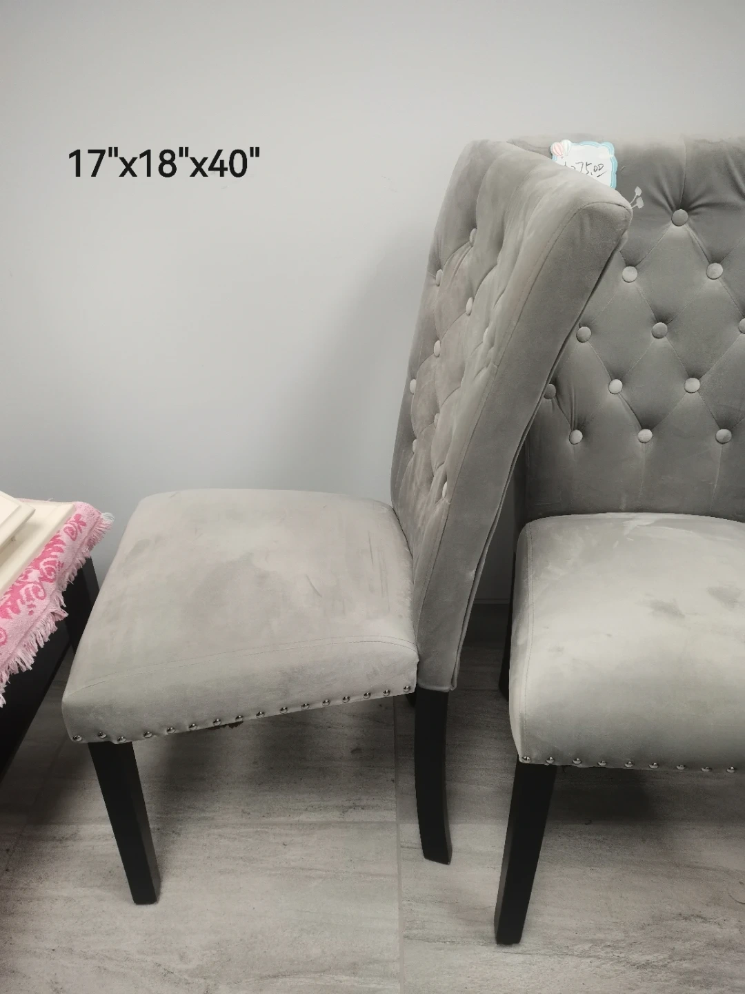 Add a touch of elegance to your dining area with these lovely grey velvet chairs! These used chairs each measure 17" x 18" x 40" and feature stylish button-tufted backs. They are in good condition, ready to bring comfort and sophistication to your home.