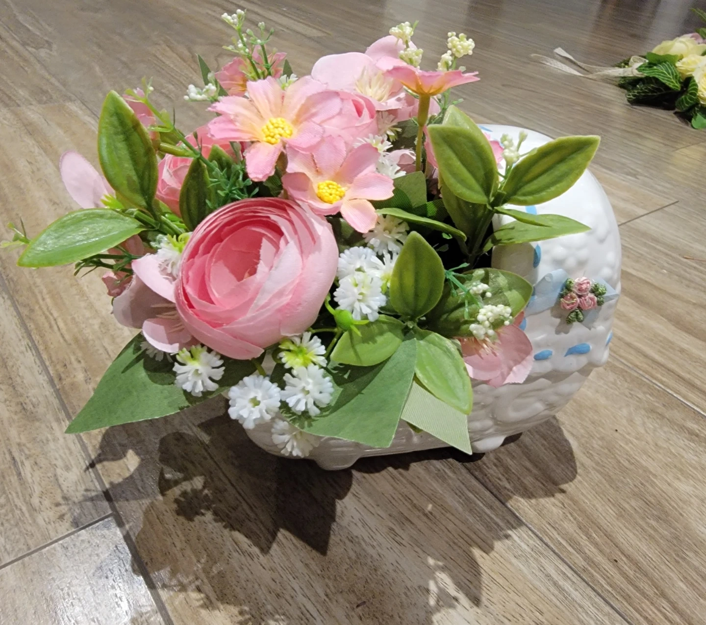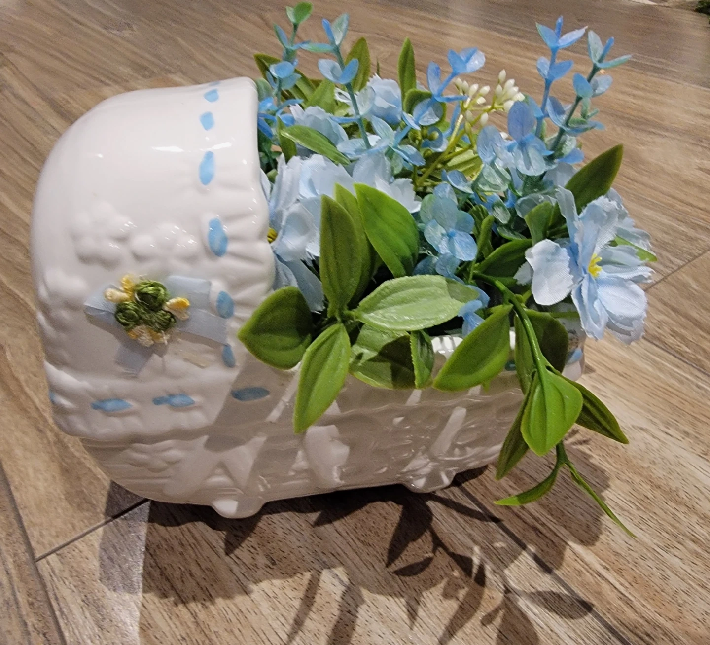 This is a charming ceramic flower pot shaped like a baby carriage. It's perfect for holding small plants or as a decorative piece. The pot features a delicate blue trim and a small decorative ribbon. It's a sweet addition to any nursery or home decor!