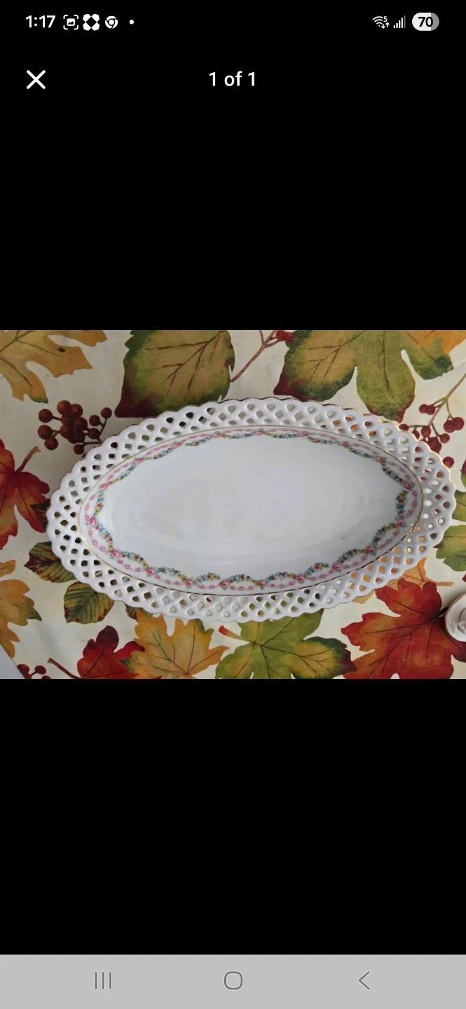 Pretty oval serving dish with a delicate floral pattern. It features a white ceramic base and a decorative lattice edge with a gold trim. Perfect for serving a side dish or dessert.