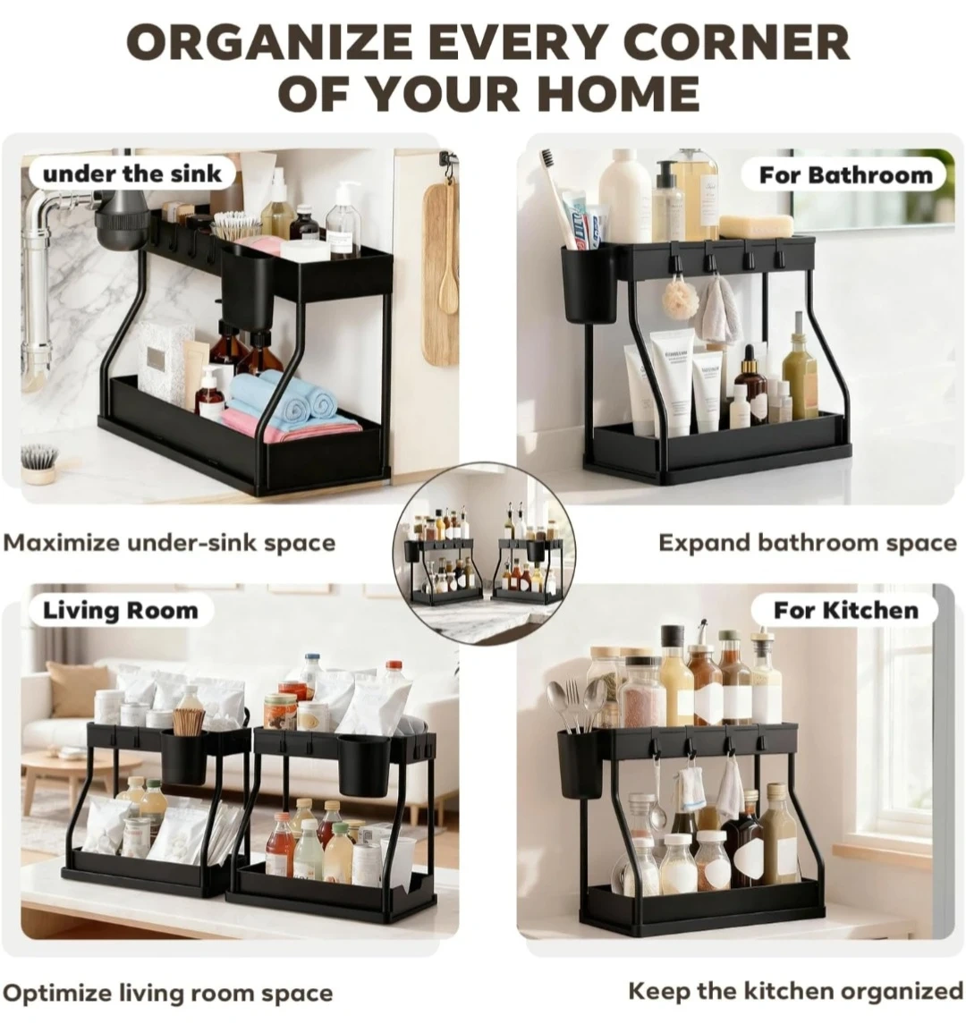 2 PACKS Under Sink Organizers and Storage with Sliding Drawer, 2-Tier Bathroom Under Sink Shelf Rack, Multi-Functional Cabinet Storage Space Saver For Kitchen, Bathroom and Bedroom.