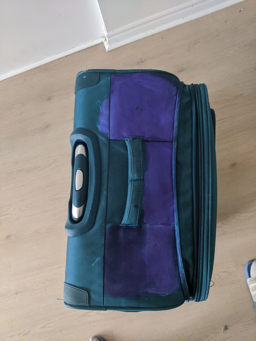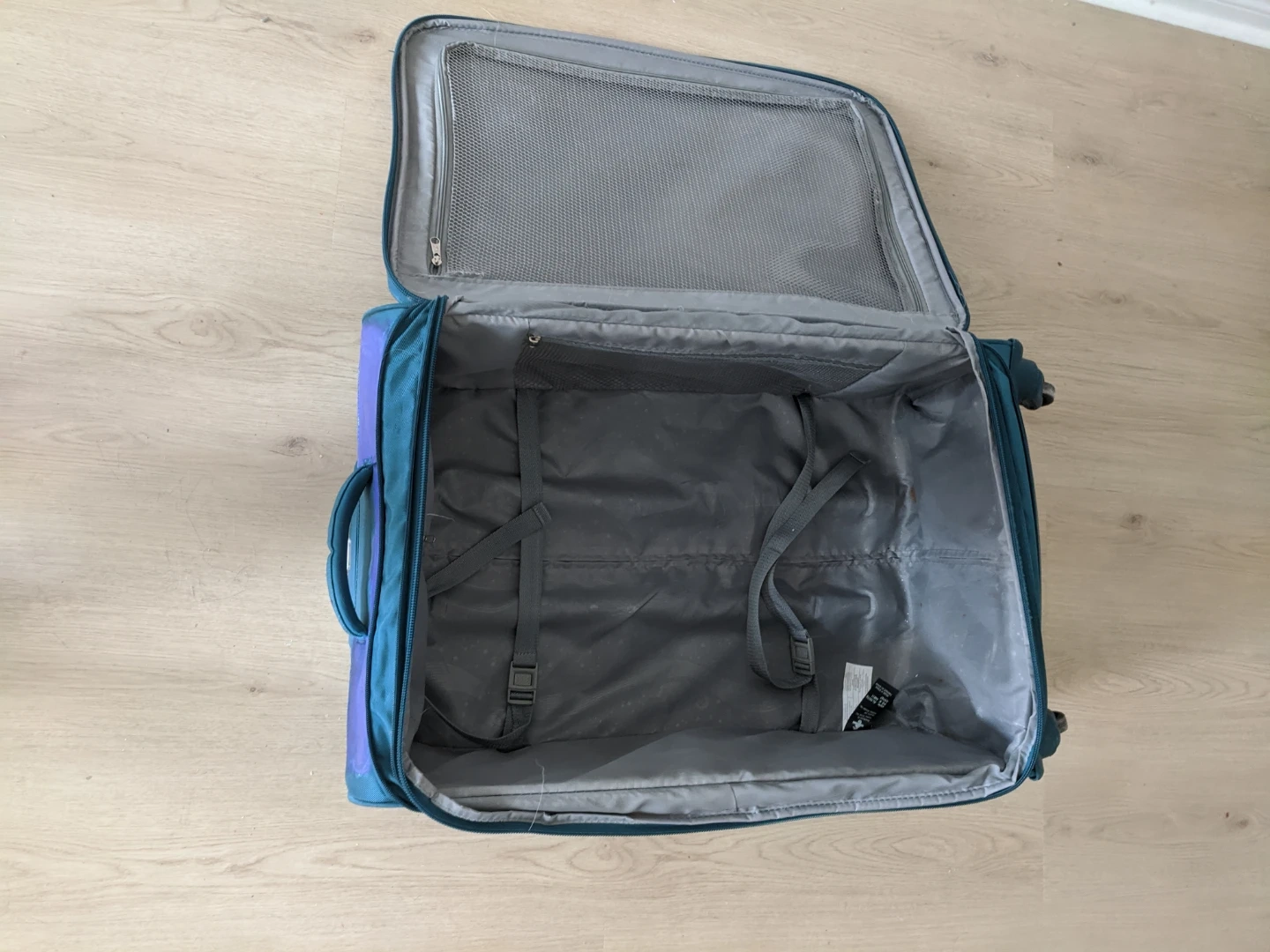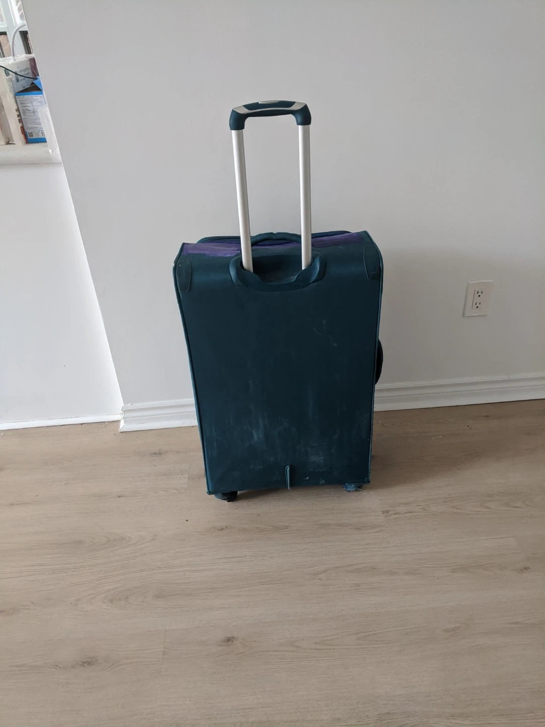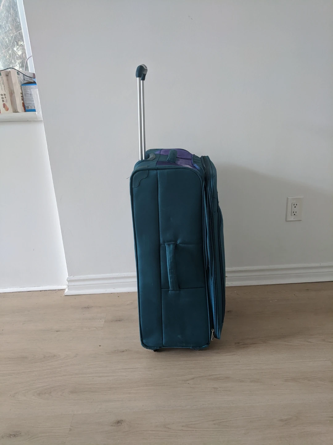 Teal rolling suitcase with purple accents and a retractable handle. It's made of durable fabric and has multiple zippered compartments. Wheels at the base for easy transport. Old but ok. Pick up at 195 Merton Street Toronto or pick up at subway station Davisvill. And I can deliver it to your house but you need to pay me another $3. Thanks.