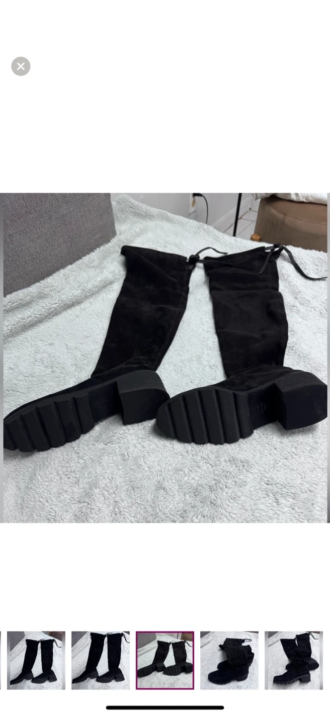 Black suede over-the-knee boots. Flat heel with a lug sole. Lace-up detail at the back. Suede material.