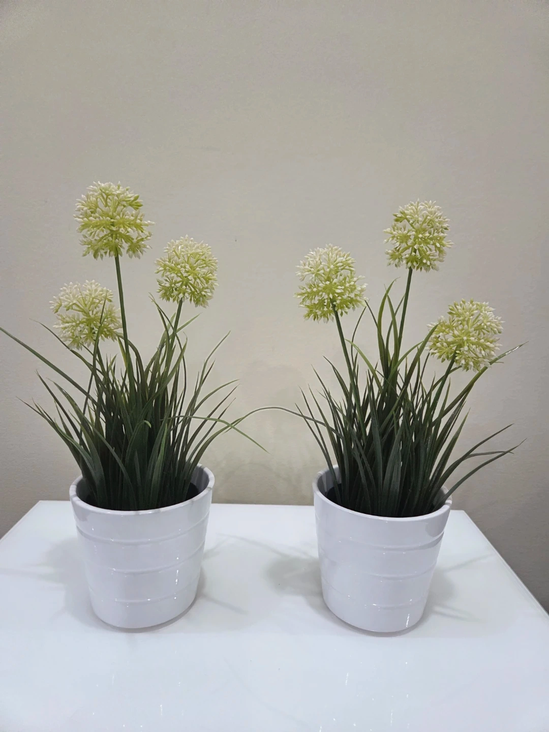 This set includes two artificial allium floral arrangements in white planters. Each pot features a ribbed design and holds green grass-like foliage topped with white allium blooms. They're a great way to add a touch of greenery without the maintenance. Plastic and ceramic construction.