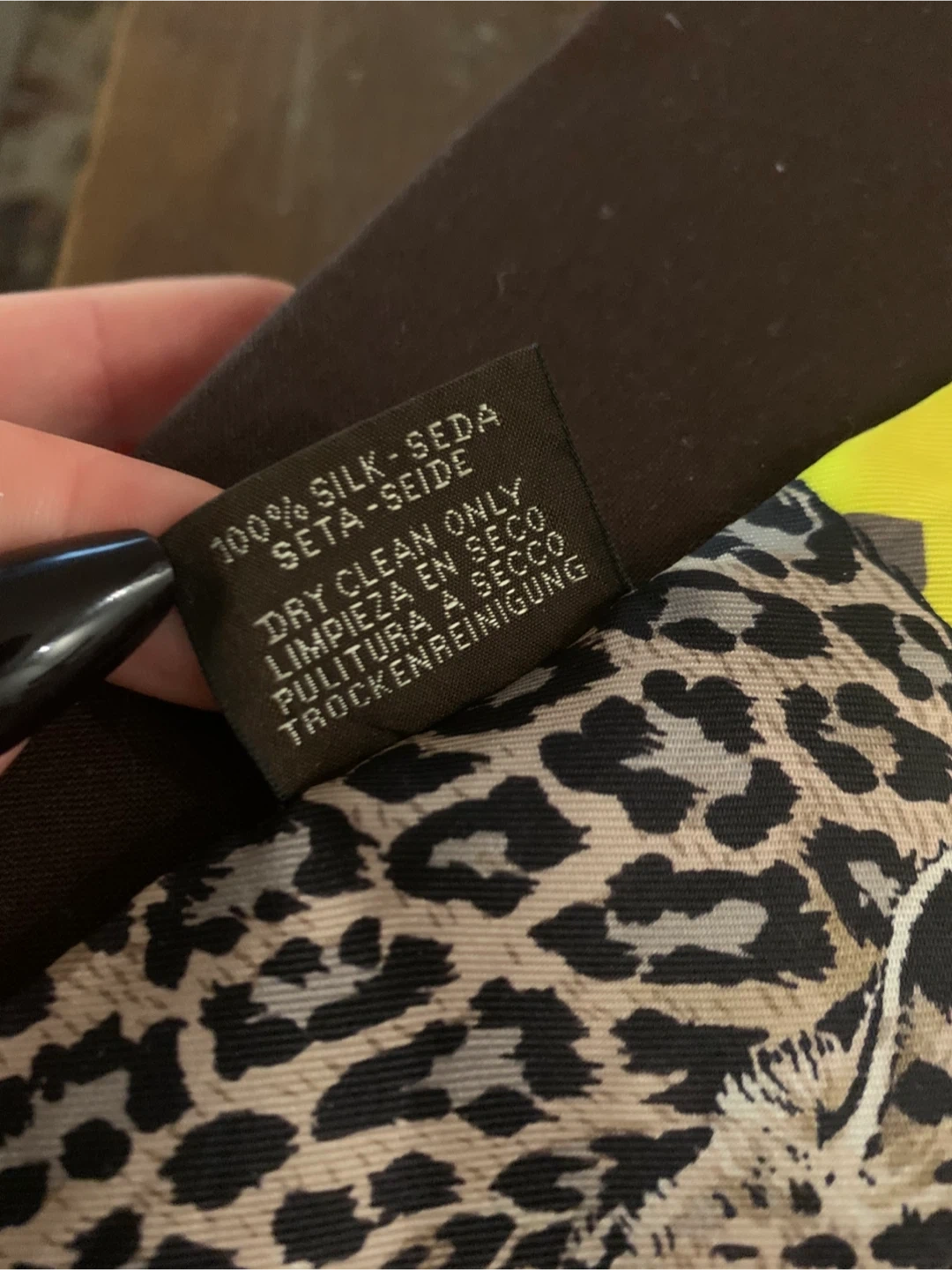 This is a vibrant authentic Hermès Paris Twilly made of 100% silk. It features a bold leopard print on one side and a colourful bird and floral design on the other. Dry clean only.