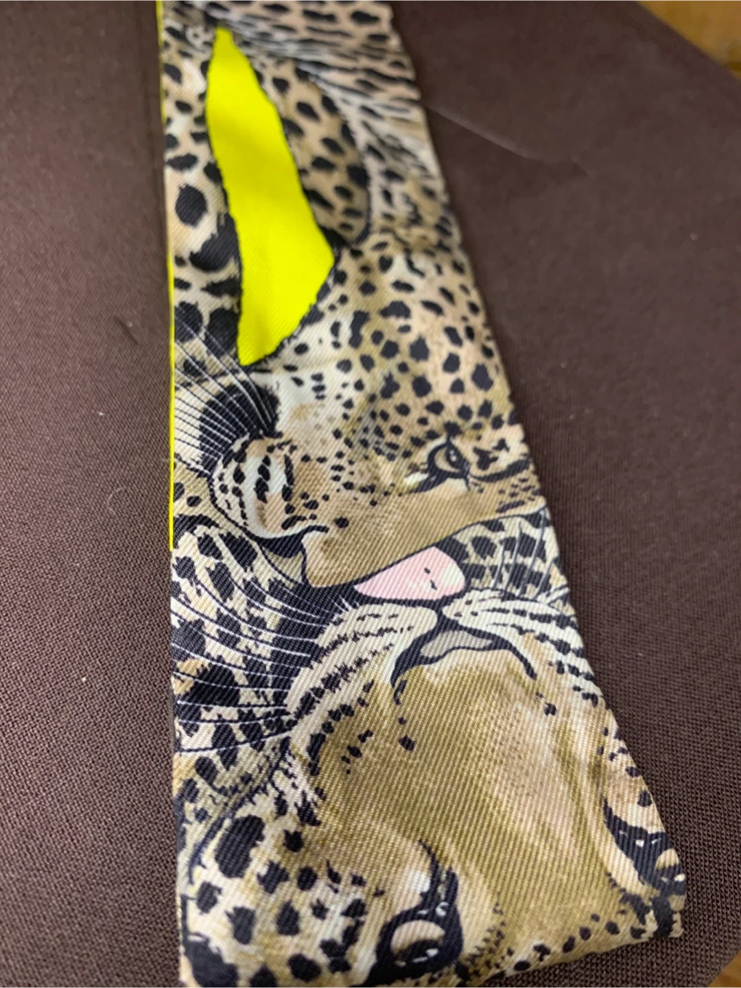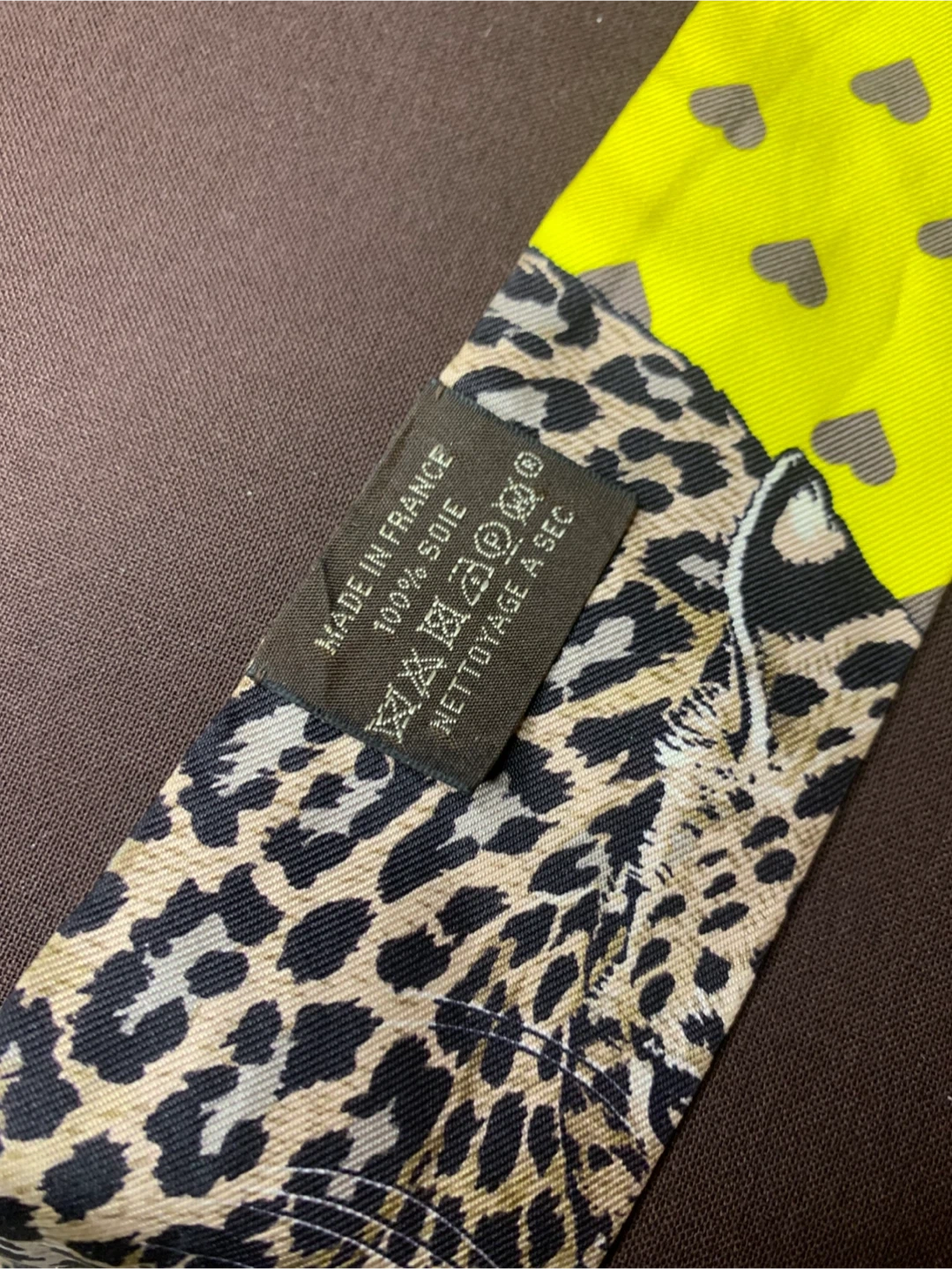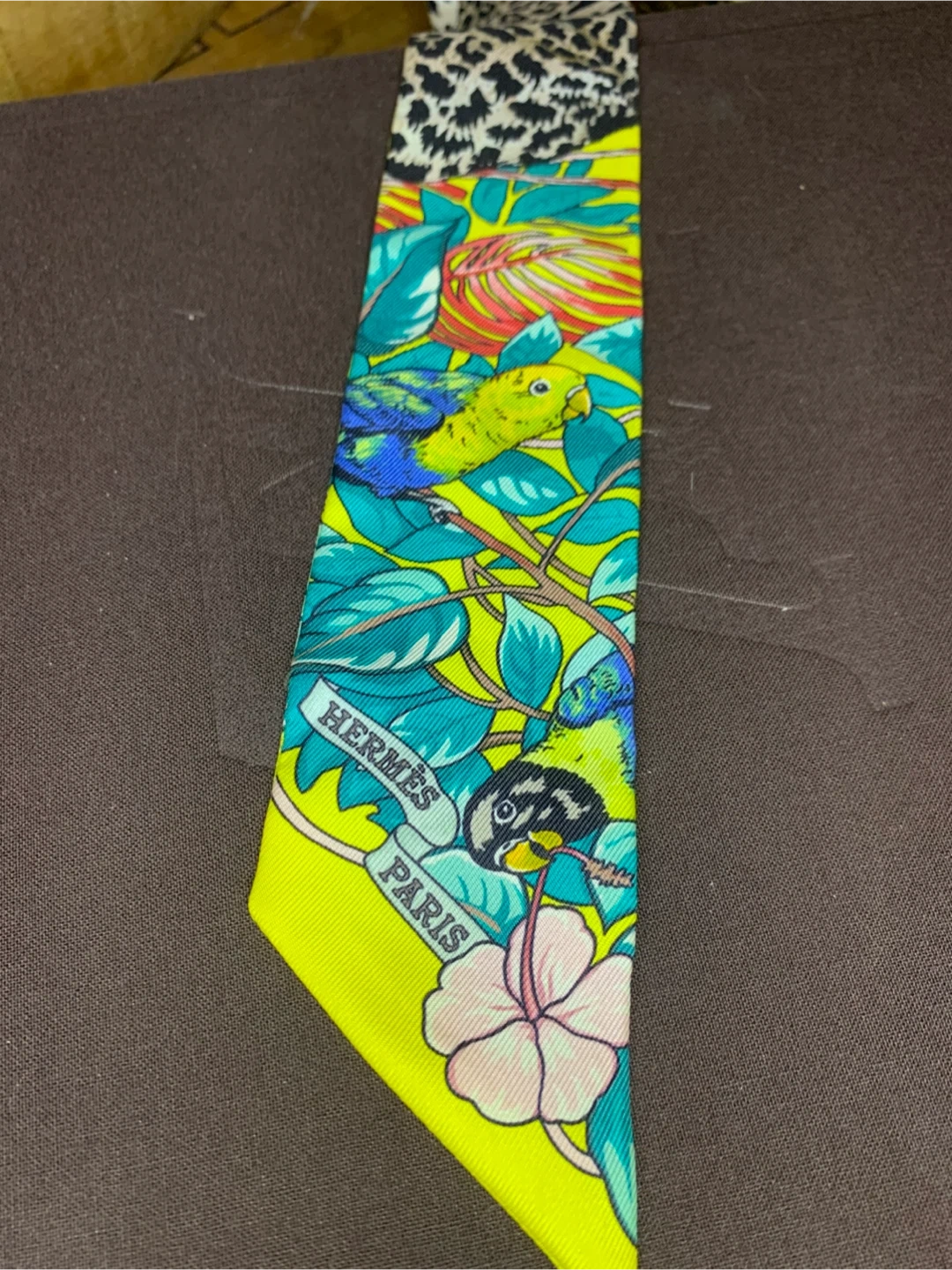 This is a vibrant authentic Hermès Paris Twilly made of 100% silk. It features a bold leopard print on one side and a colourful bird and floral design on the other. Dry clean only.
