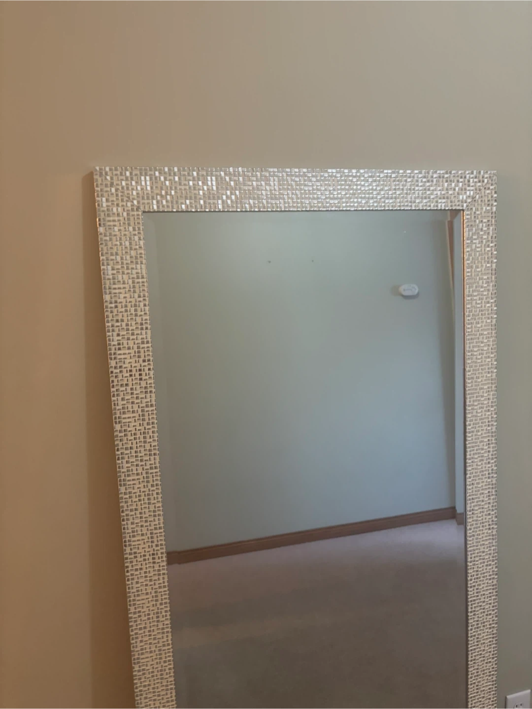 This full-length mirror features a decorative frame with a unique mosaic pattern. It's perfect for checking your outfit or adding a stylish touch to any room. Hang it using the D-rings for a secure installation.