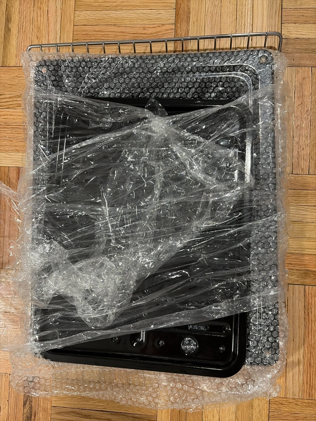This is a new baking sheet and wire rack set. It's black and made of metal. Includes the baking pan and a wire cooling rack.