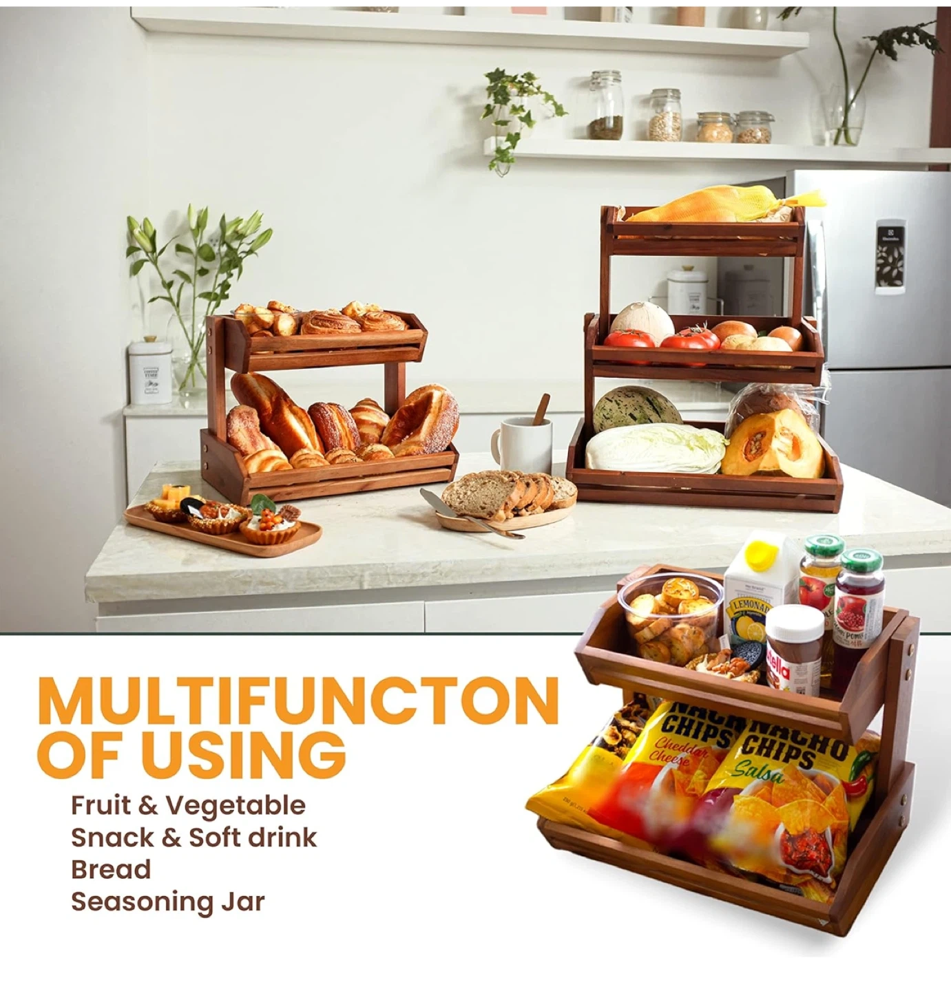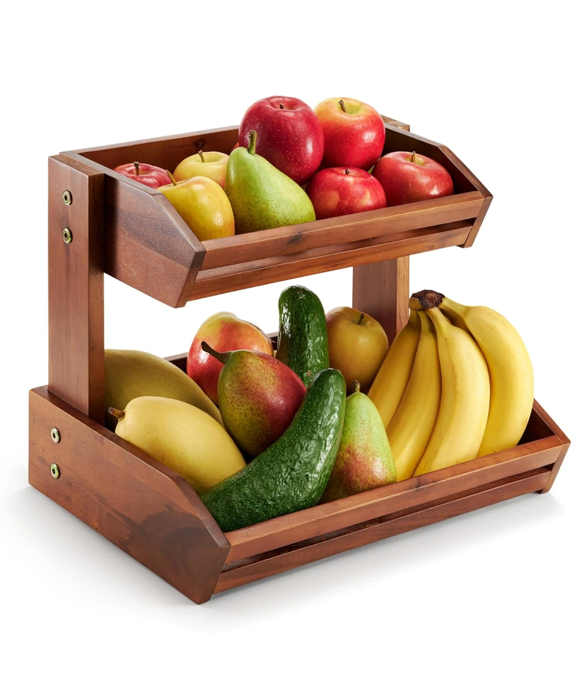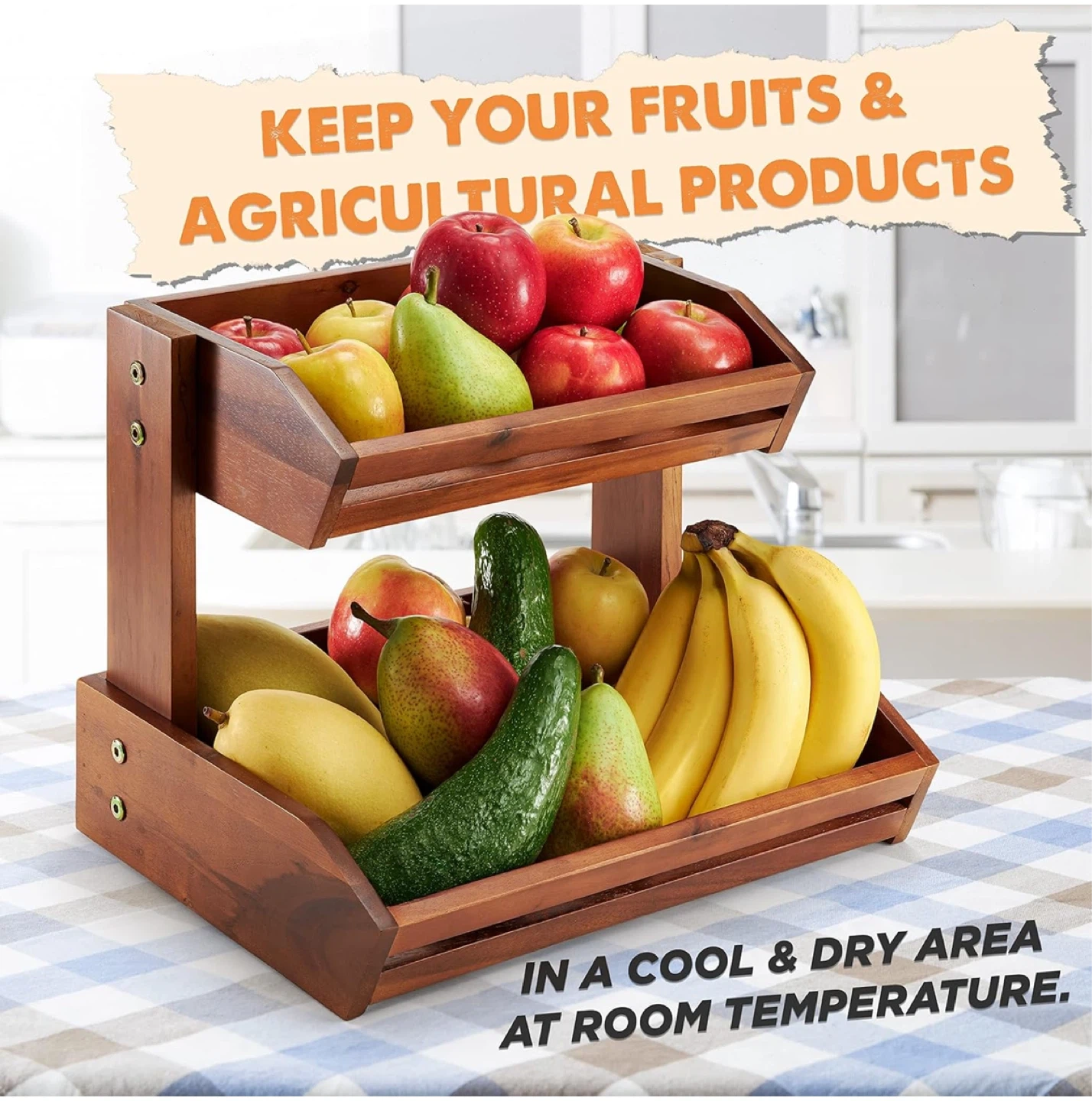 This two-tier wooden fruit basket is made from strong, thick premium acacia wood. It has a breathable structure that allows air flow to keep produce fresh. Non-slip pads protect your countertop.