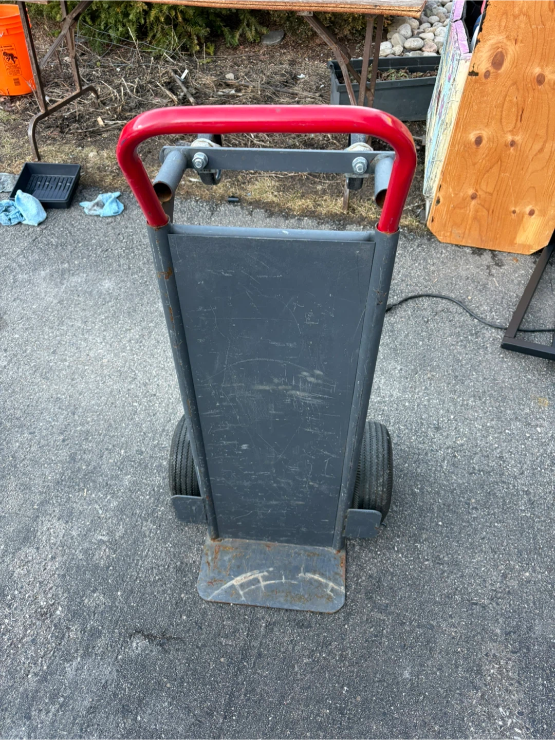 This is a sturdy hand truck dolly with large pneumatic wheels. It's made of durable metal construction and features a red handle. It's great for moving boxes and furniture!