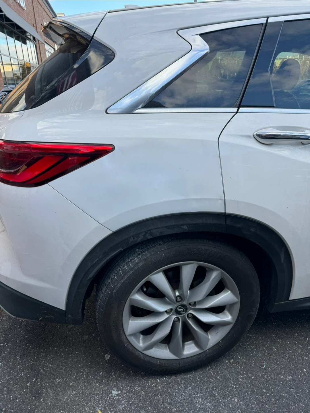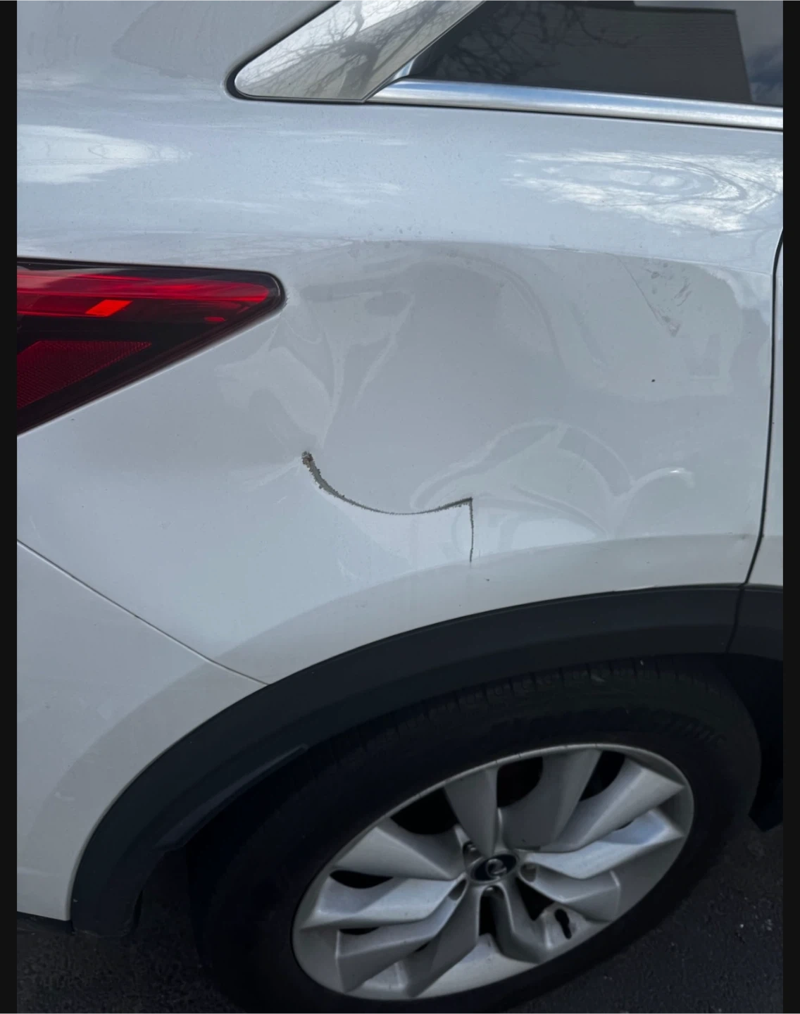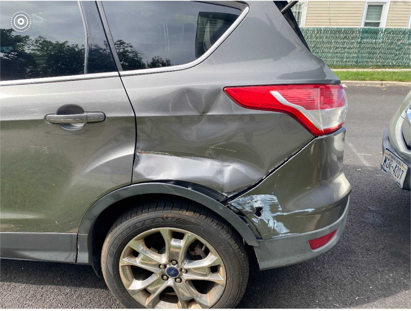 This listing is for a damaged rear quarter panel on a grey SUV. It shows significant dents and scraped paint. There's a large impact mark with visible damage to the body and trim. Sold as-is.