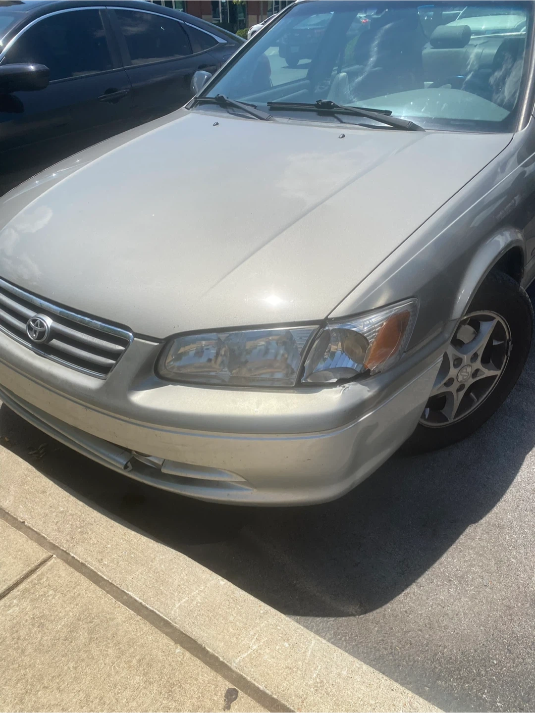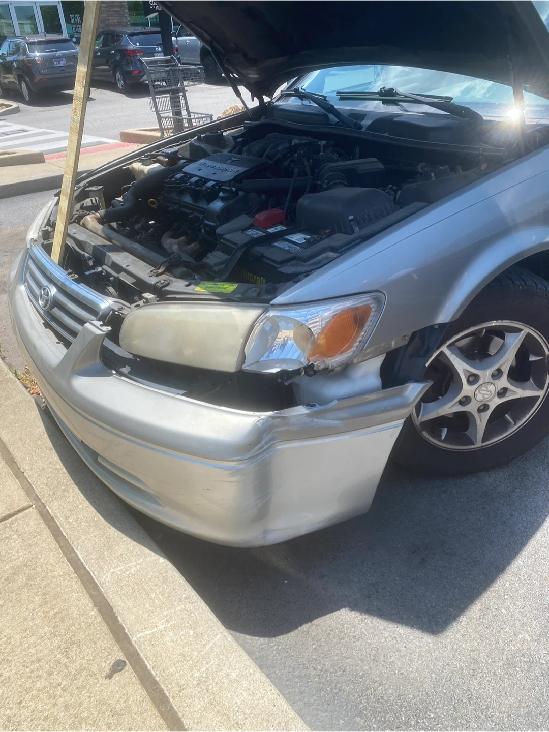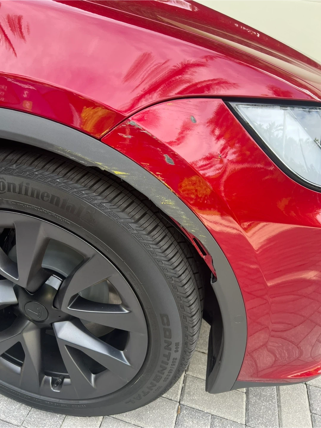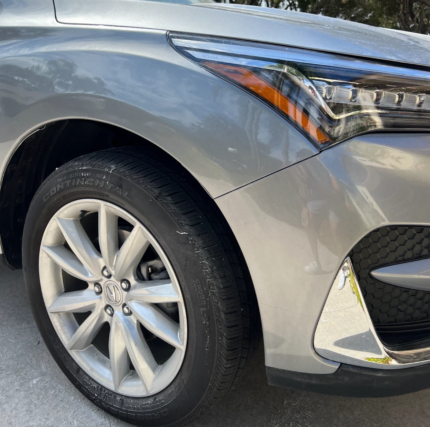 This listing is for a damaged rear quarter panel on a grey SUV. It shows significant dents and scraped paint. There's a large impact mark with visible damage to the body and trim. Sold as-is.