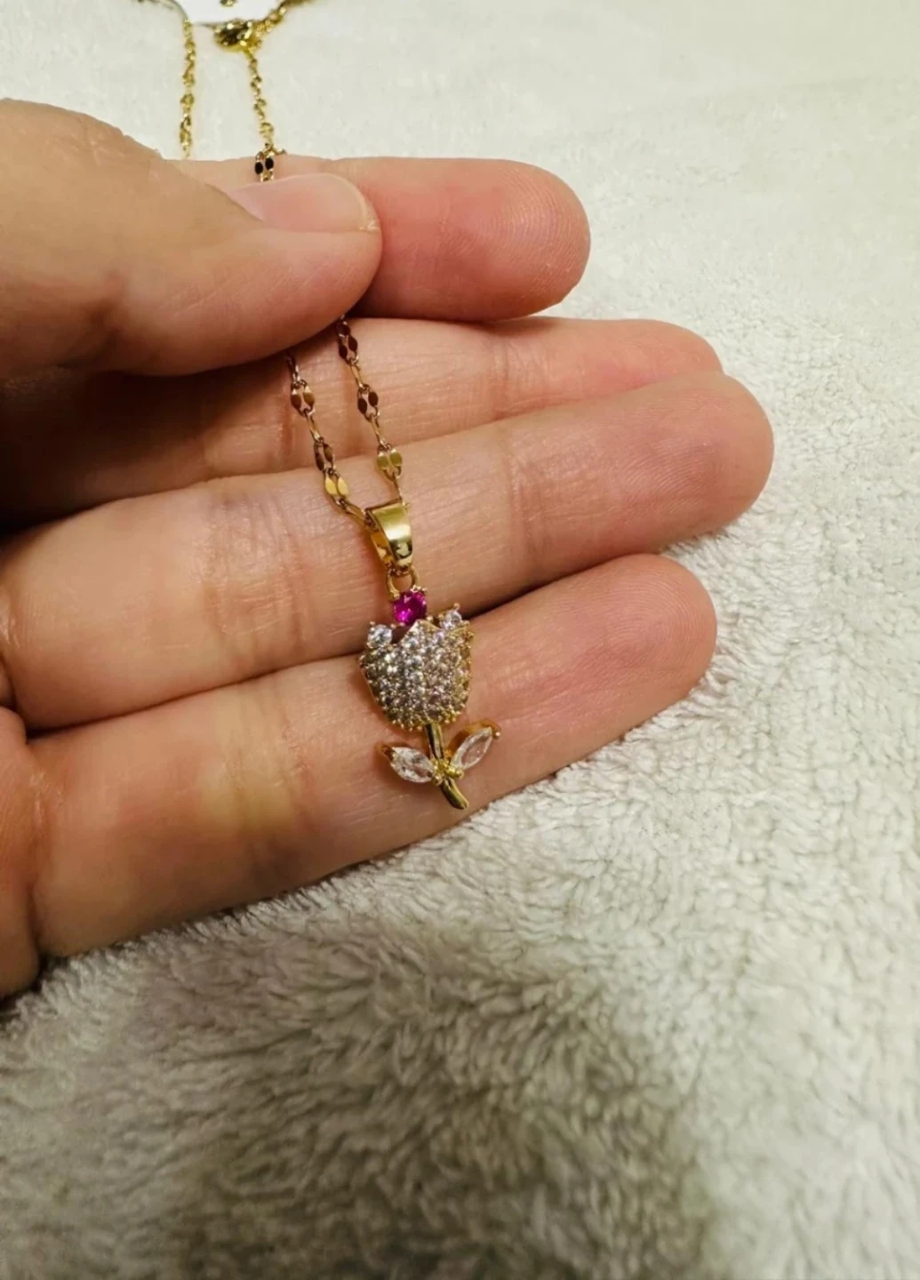 This 18kt gold plated necklace features a delicate gold-tone chain with a charming rose pendant. The rose is adorned with sparkling clear crystals and a single pink crystal accent. It's a lovely piece for adding a touch of elegance to any outfit.