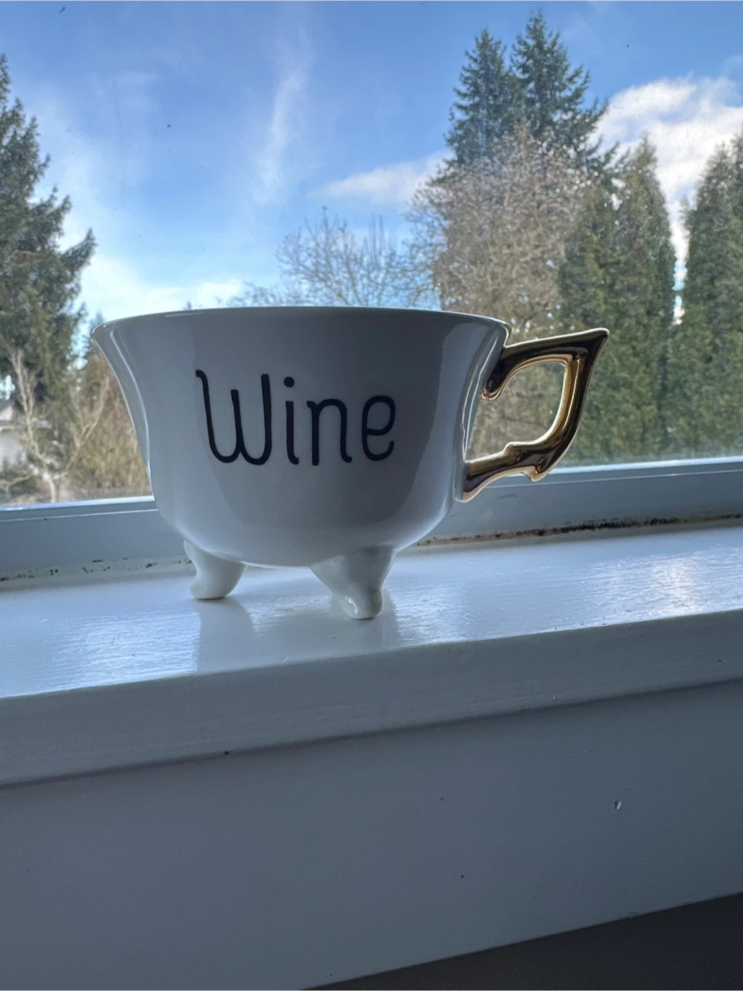 White ceramic cup with the word "Wine" printed in black. It has a unique gold-coloured handle and sits on three small feet.
