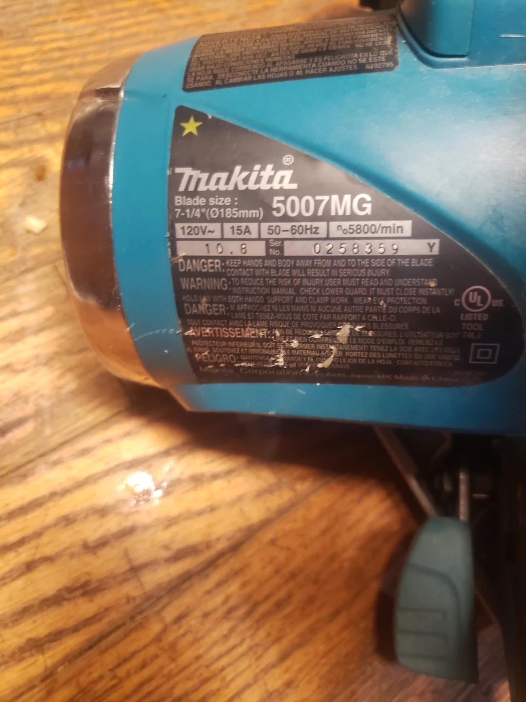 This is a Makita 5007MG circular saw with a 7-1/4 inch blade. It operates at 120V, 15A, and 50-60Hz with 5800 RPM. The housing is made of magnesium.