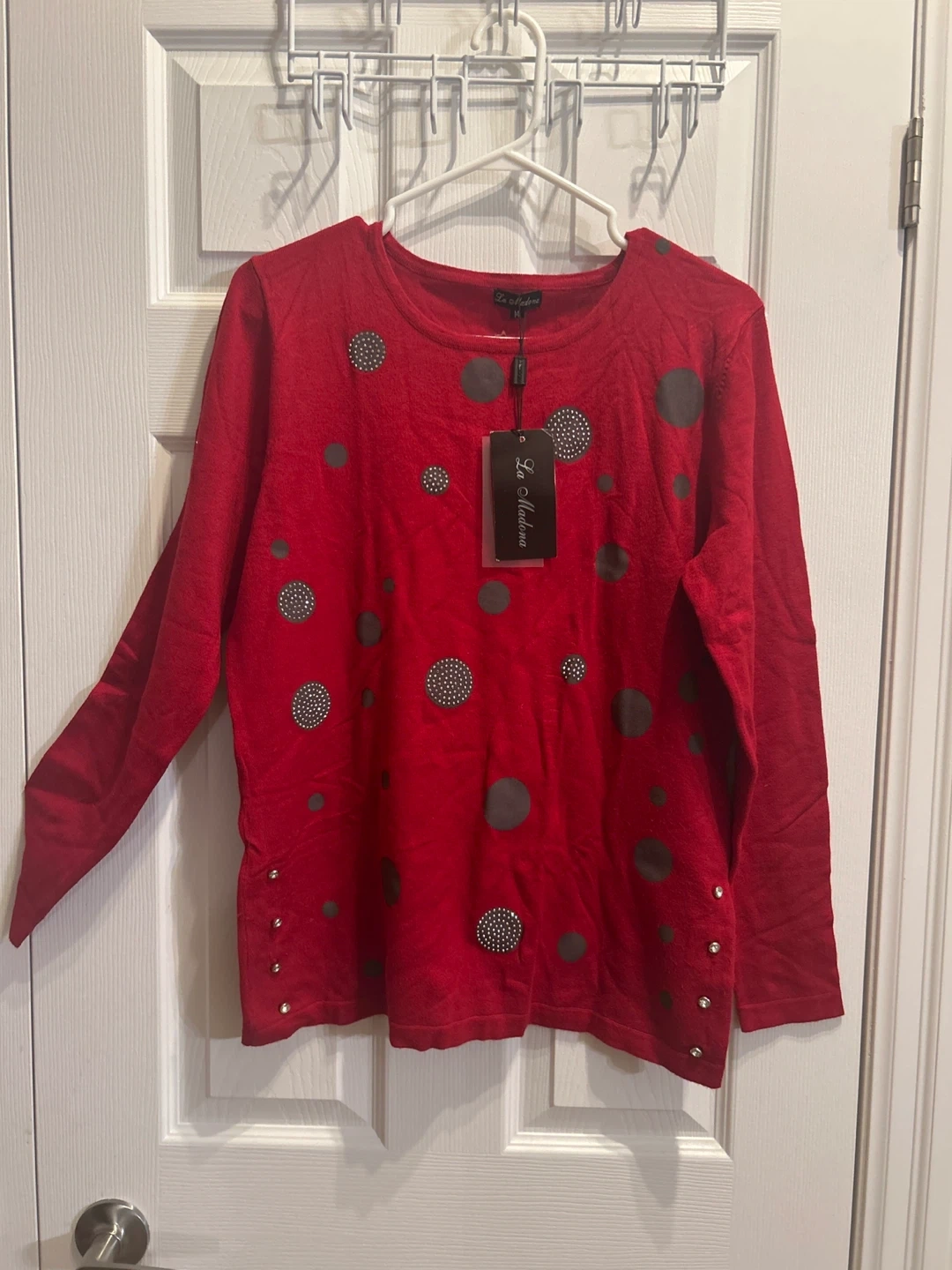 This La Moda sweater is a vibrant red with a long sleeve design. It's decorated with an array of grey polka dots and sparkling embellishments. It has decorative buttons along the side seams.