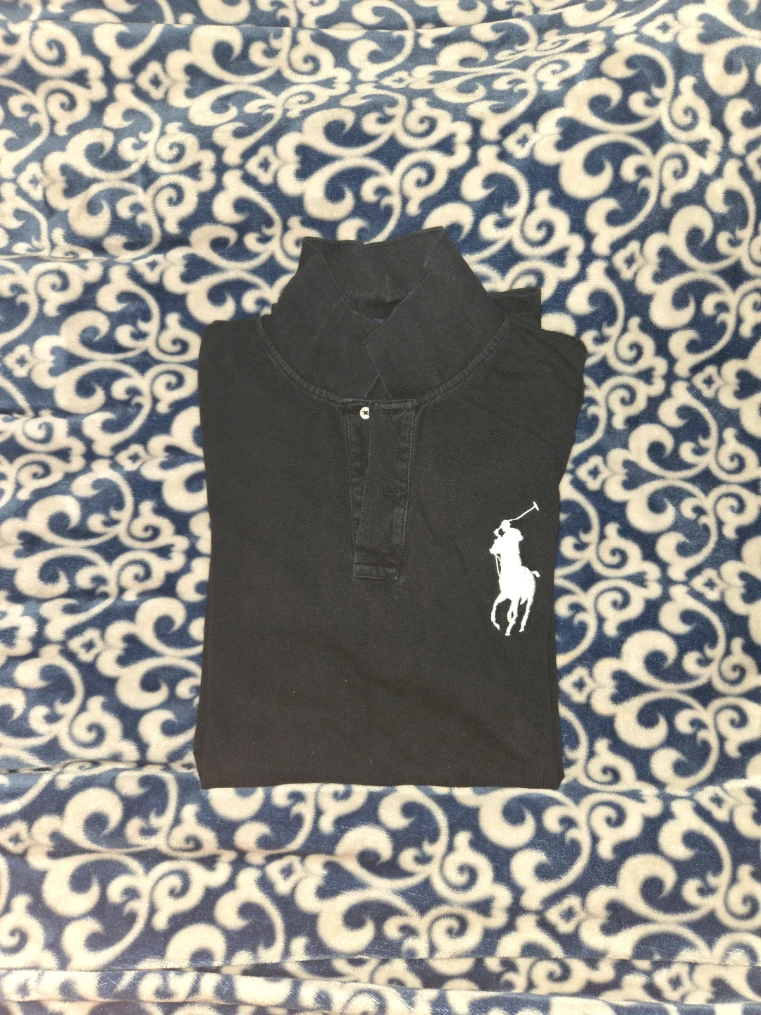 Black Ralph Lauren short-sleeved polo shirt. Features the iconic white polo player logo embroidered on the chest with a number on the right sleeve. Cotton material.