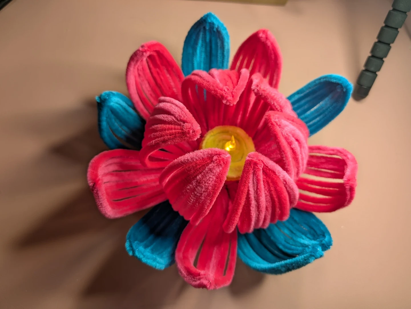 A unique handmade flower decoration crafted from colourful pipe cleaners. It features vibrant pink and teal petals with a glowing yellow centre. This decorative piece adds a pop of colour and light to any space. It's a lovely handmade accent for a desk or shelf!