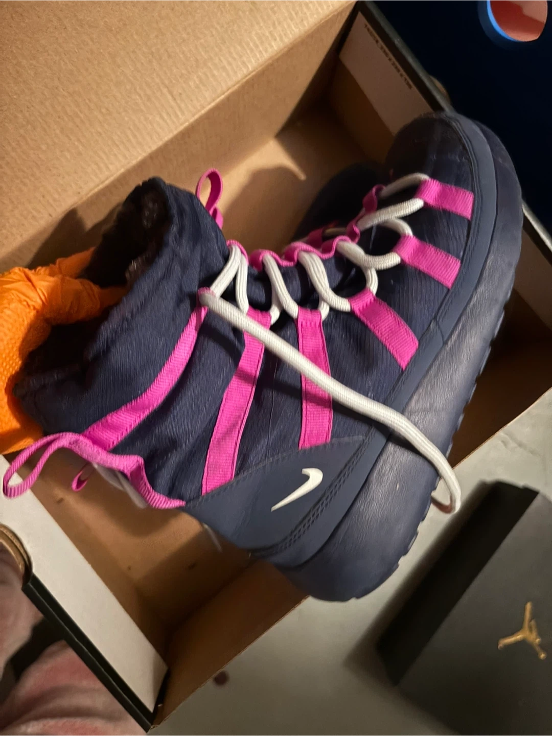 These Nike sneakers feature a navy blue exterior with bright pink accents and white laces. They're lined with soft gray faux fur for extra warmth. Includes original box.