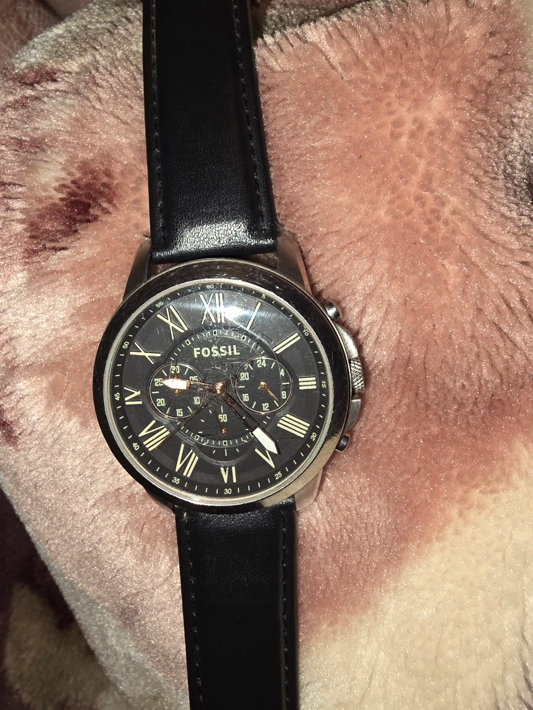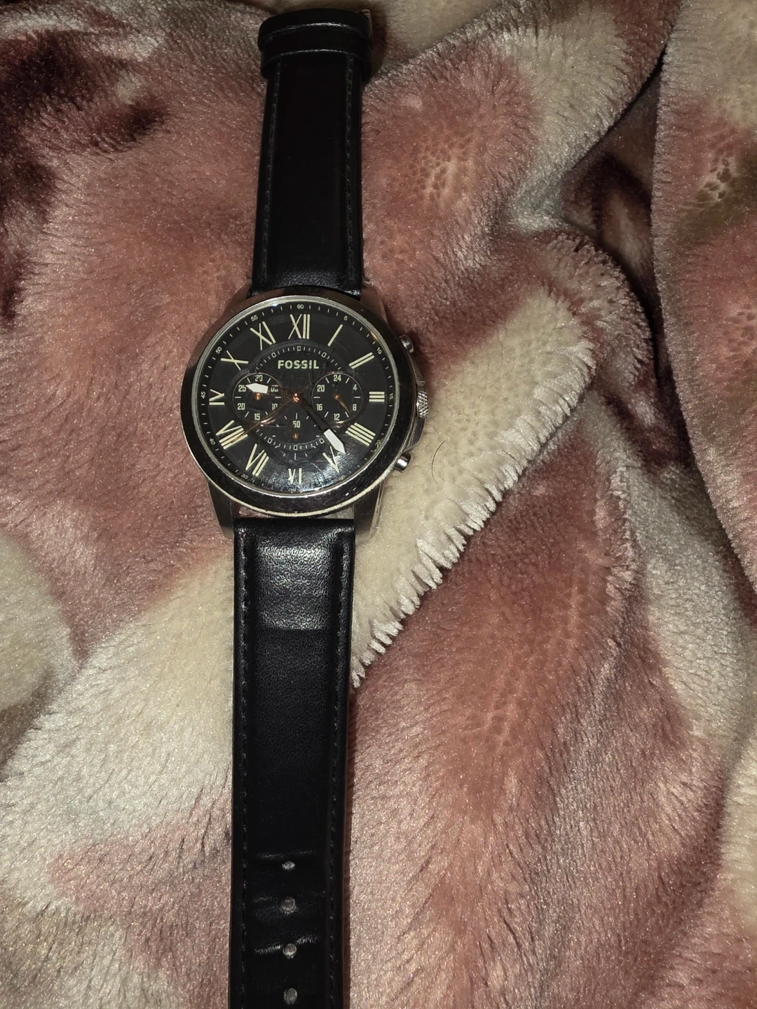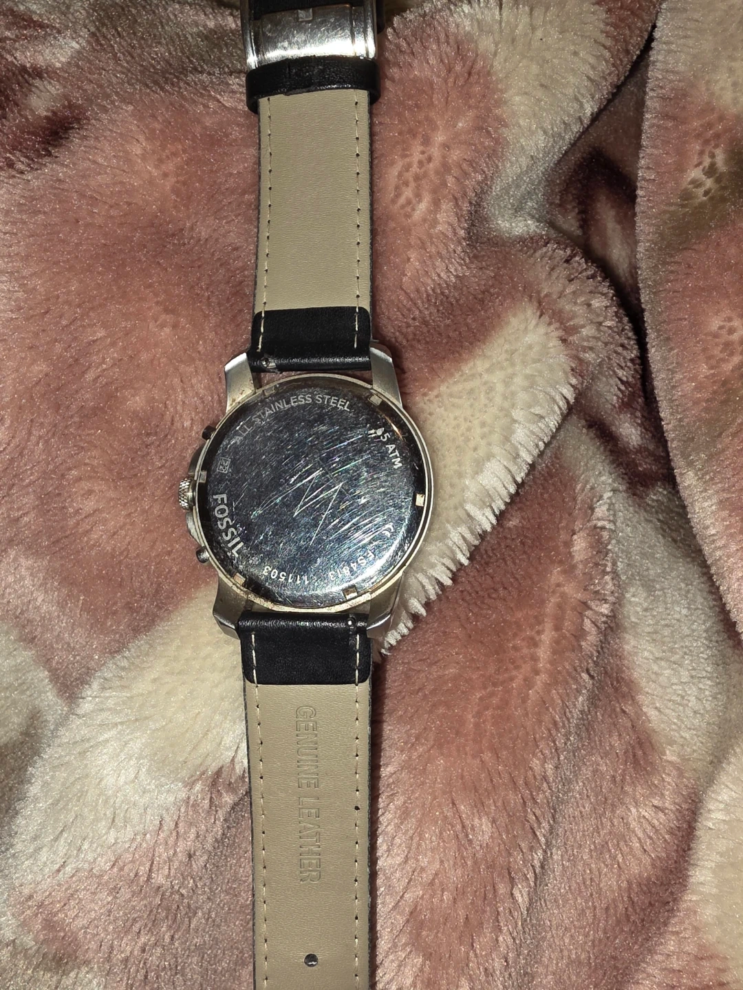 Selling a Fossil watch with a black leather strap. The watch face has Roman numerals and chronograph subdials. The back of the watch is stainless steel. There are some scratches on the back, but the front is in good condition