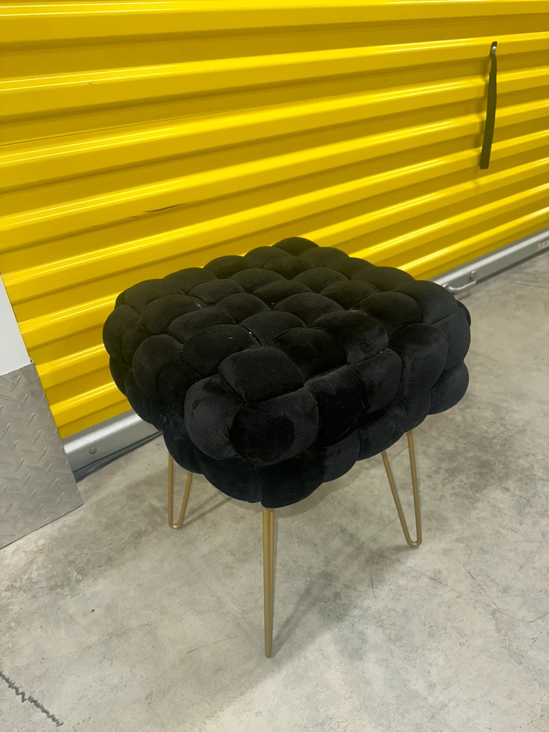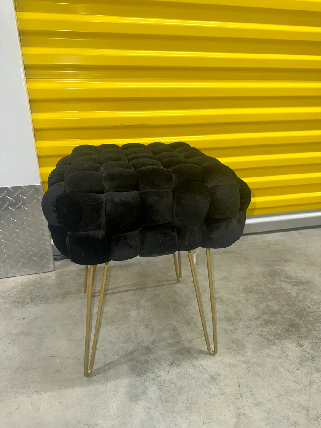 This black velvet ottoman pouf features a stylish tufted design and sturdy gold metal legs. It's a chic accent piece for any room. It measures approximately 15 inches in height and 16 inches in diameter.
