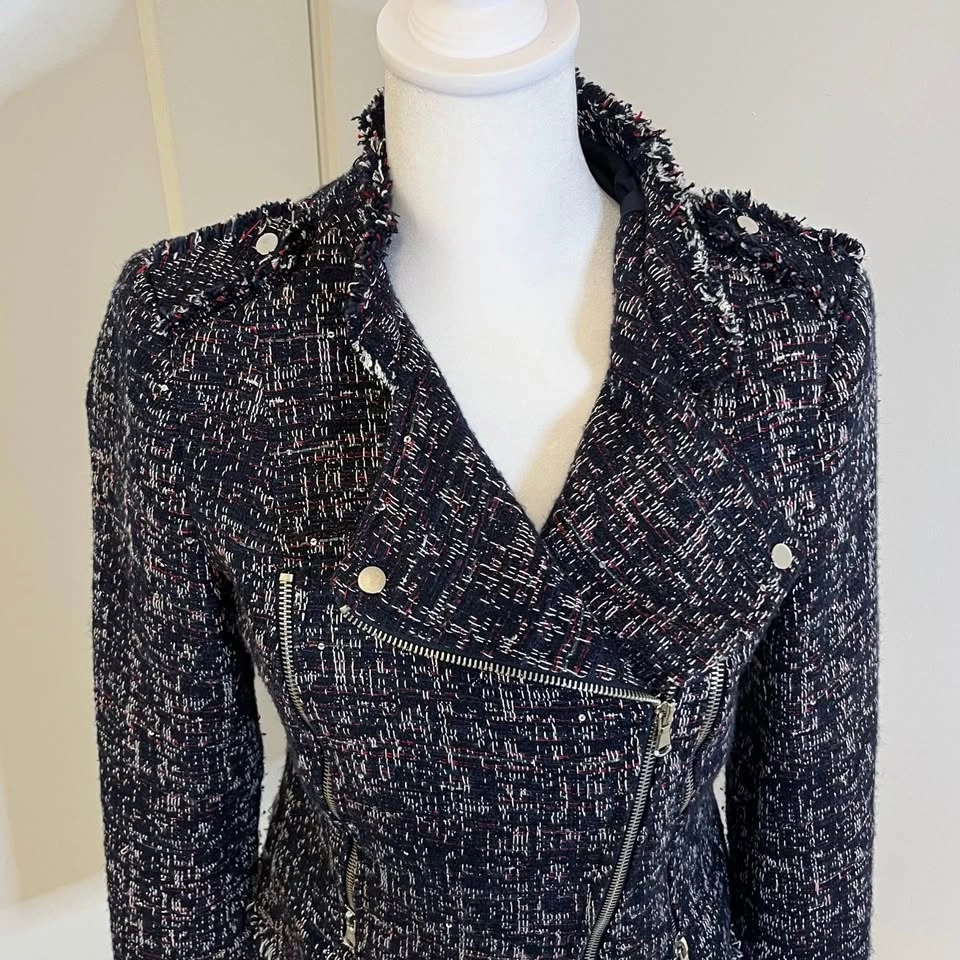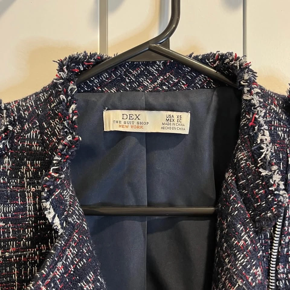 DEX tweed jacket with asymmetrical zipper. Features a dominantly navy blue textured design with red and white highlights and little sequins throughout. Side zippers with pockets. Size XS but fits more like a small.