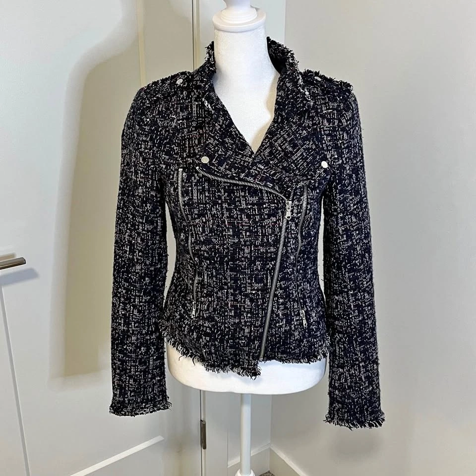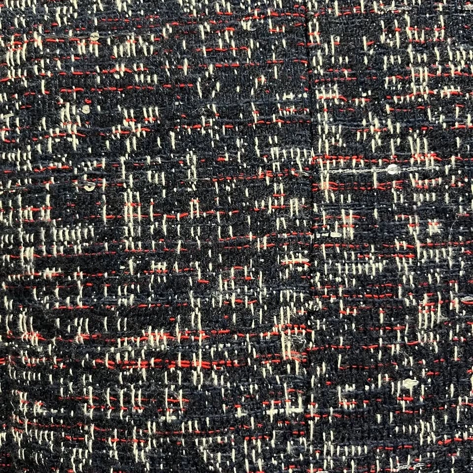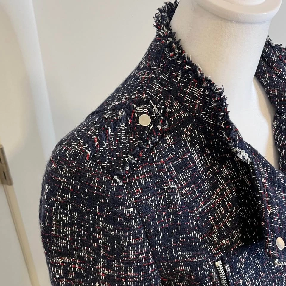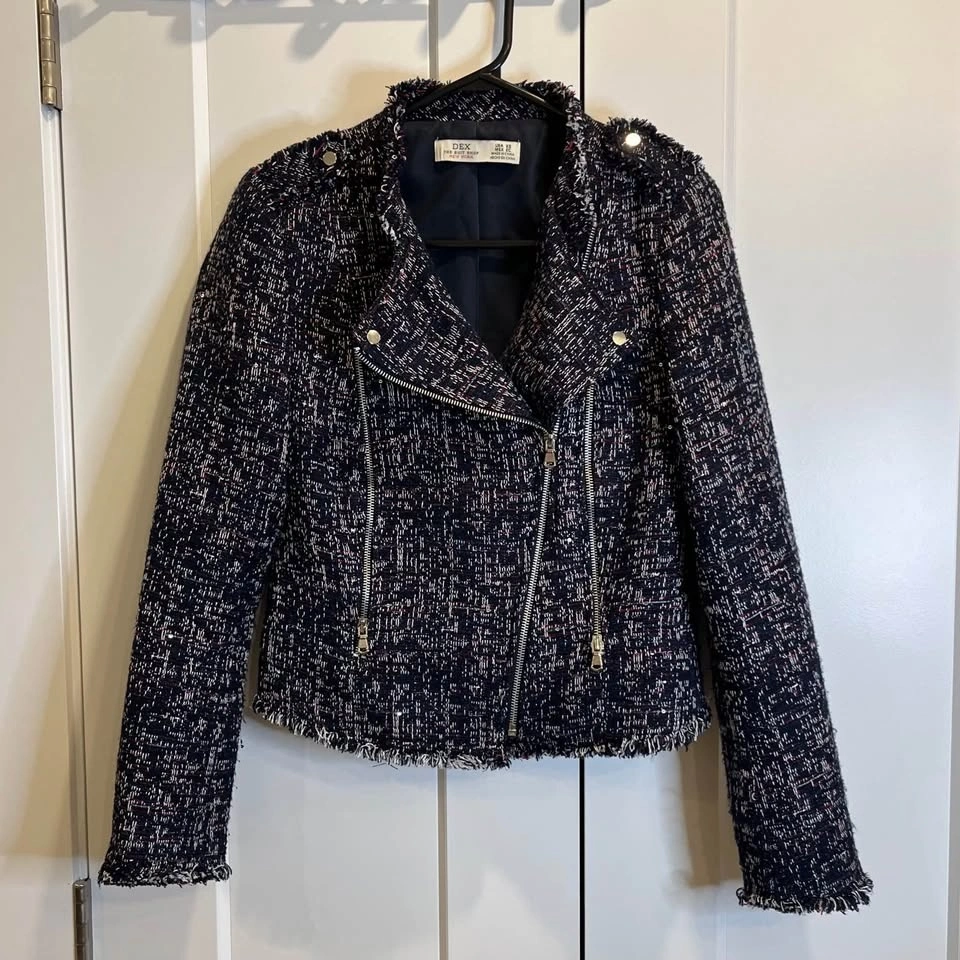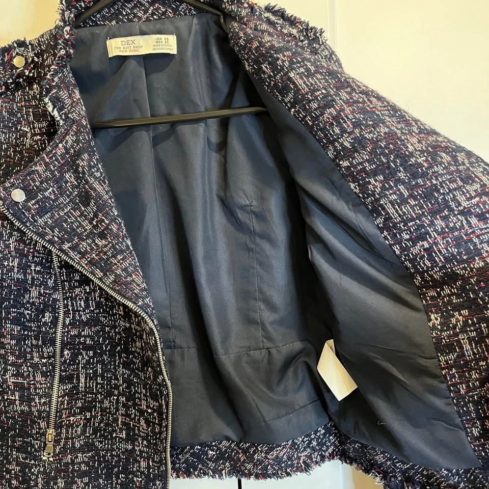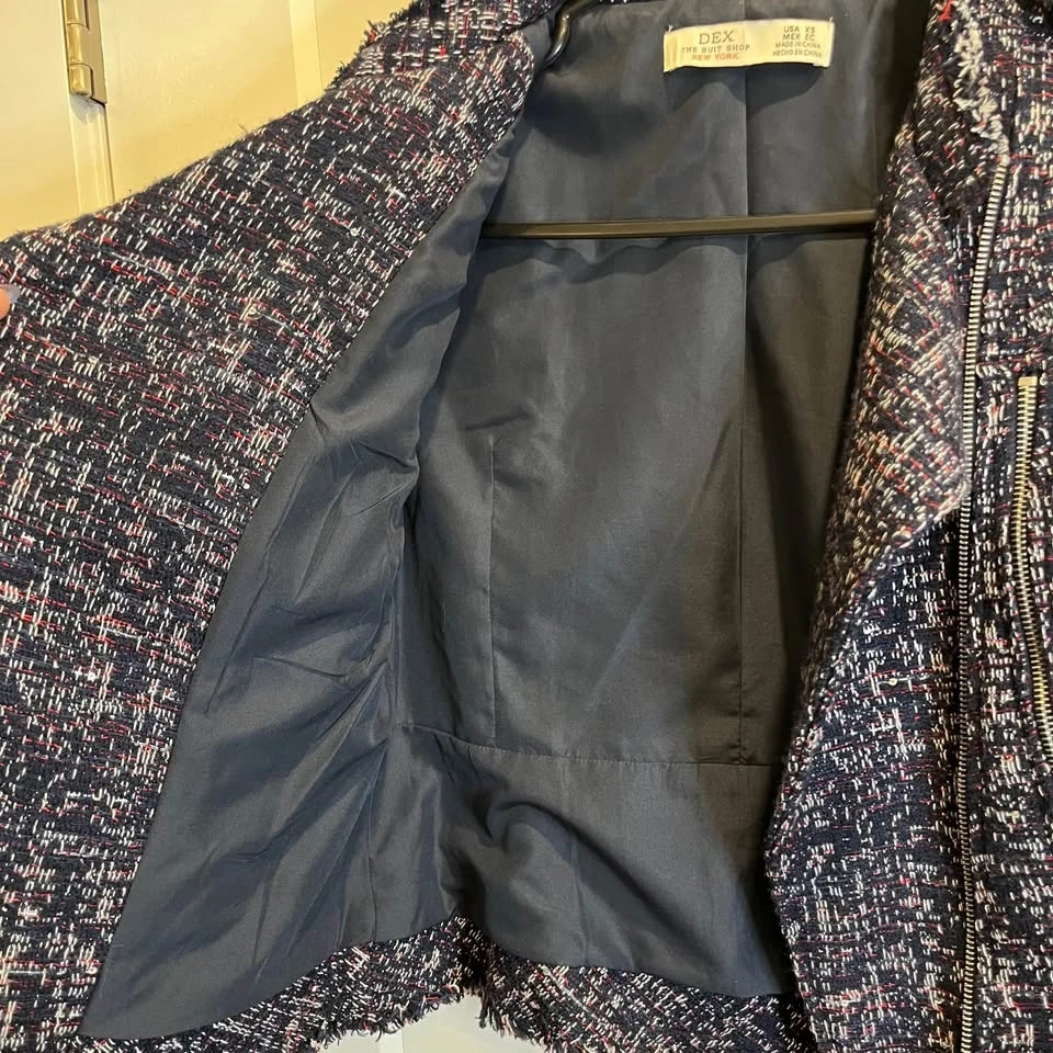 DEX tweed jacket with asymmetrical zipper. Features a dominantly navy blue textured design with red and white highlights and little sequins throughout. Side zippers with pockets. Size XS but fits more like a small.