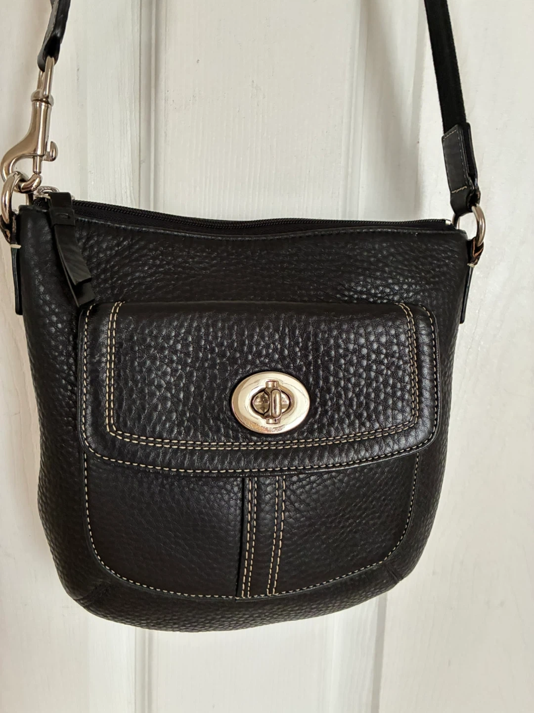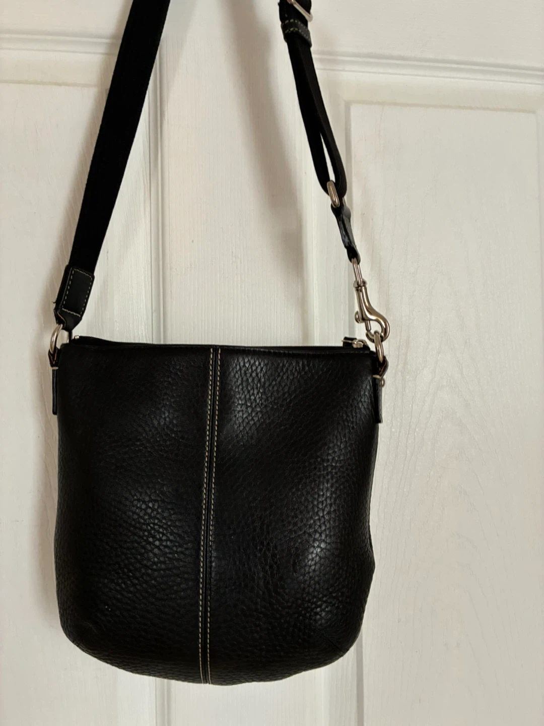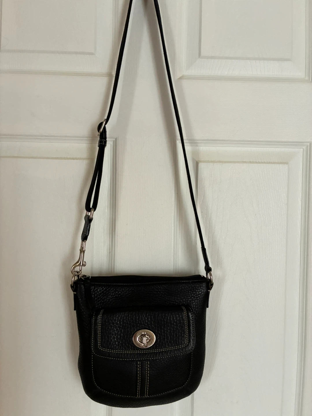 Black pebbled leather crossbody purse.