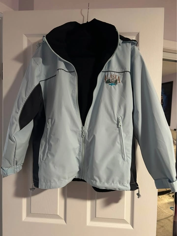 When we were in Alaska on our Disney Cruise I ended up buying 2 of these jackets of different colors. I am selling this one and it is brand new and never been worn. It has a warm fleece and is great for these cooler days. It is size XS and that is a unisex size so fits like a 10/12 for women.