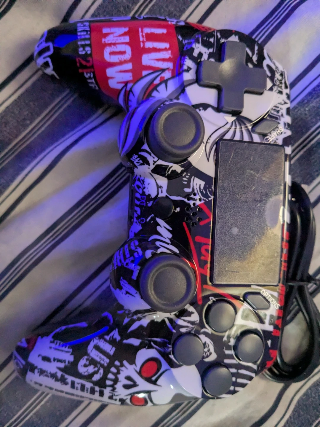 This controller has a unique 'Live Now' graphic design. It features standard PS4 button layout and a wired connection. It's perfect for anyone wanting a personalized gaming experience.