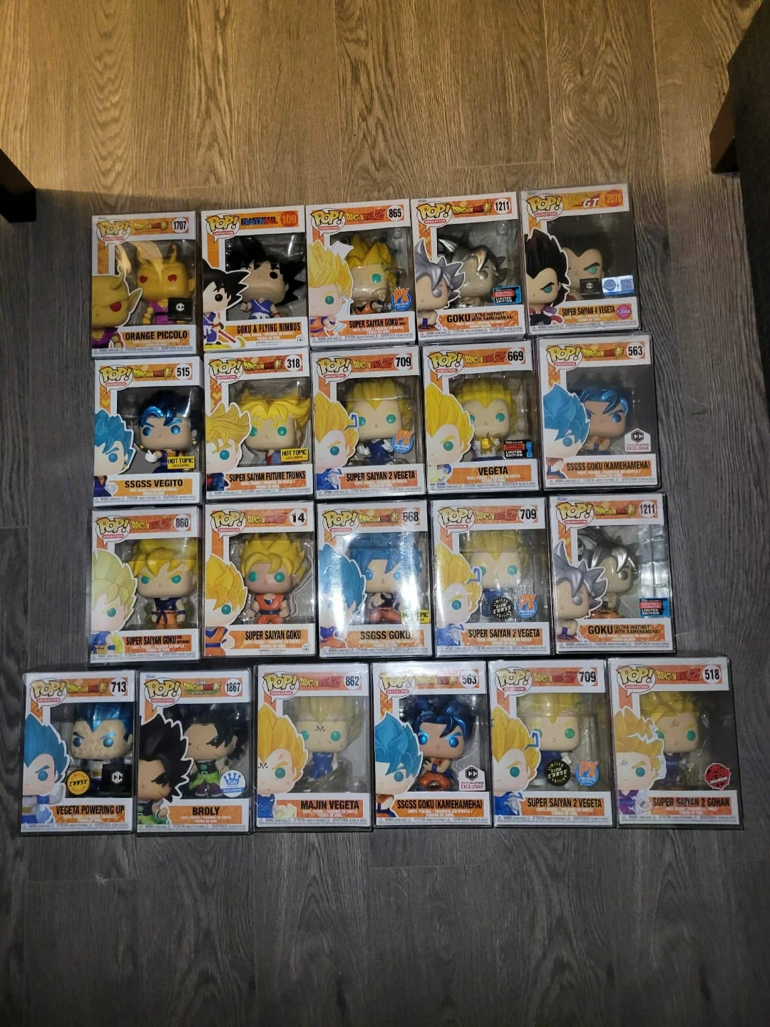This is a collection of Funko Pop! vinyl figures featuring characters from Dragon Ball Z. Figures include various forms of Goku, Vegeta, Piccolo, Broly, and more. Some figures are Hot Topic exclusives.
