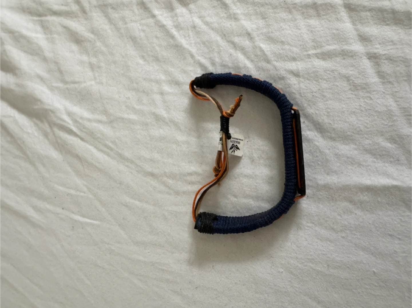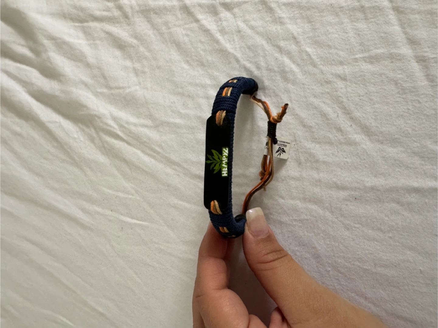 HEMPARU woven bracelet with adjustable tie closure. Features a black band with a green hemp leaf emblem. Navy blue and orange woven details.
