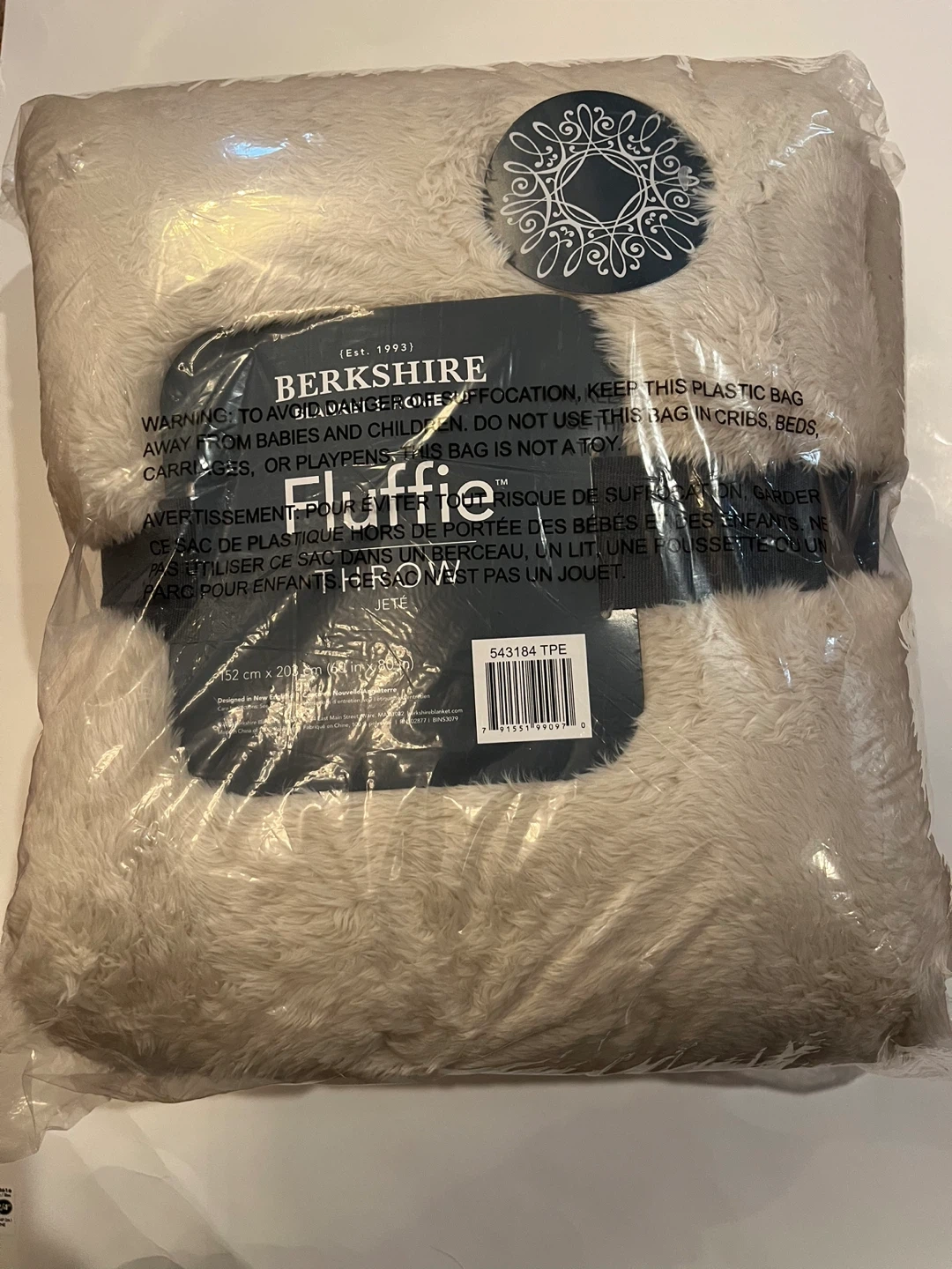 Stay cozy with this Berkshire Fluffie throw blanket. Cream coloured and made with soft, fluffy material. Dimensions are 152 cm x 203 cm (60 in x 80 in).