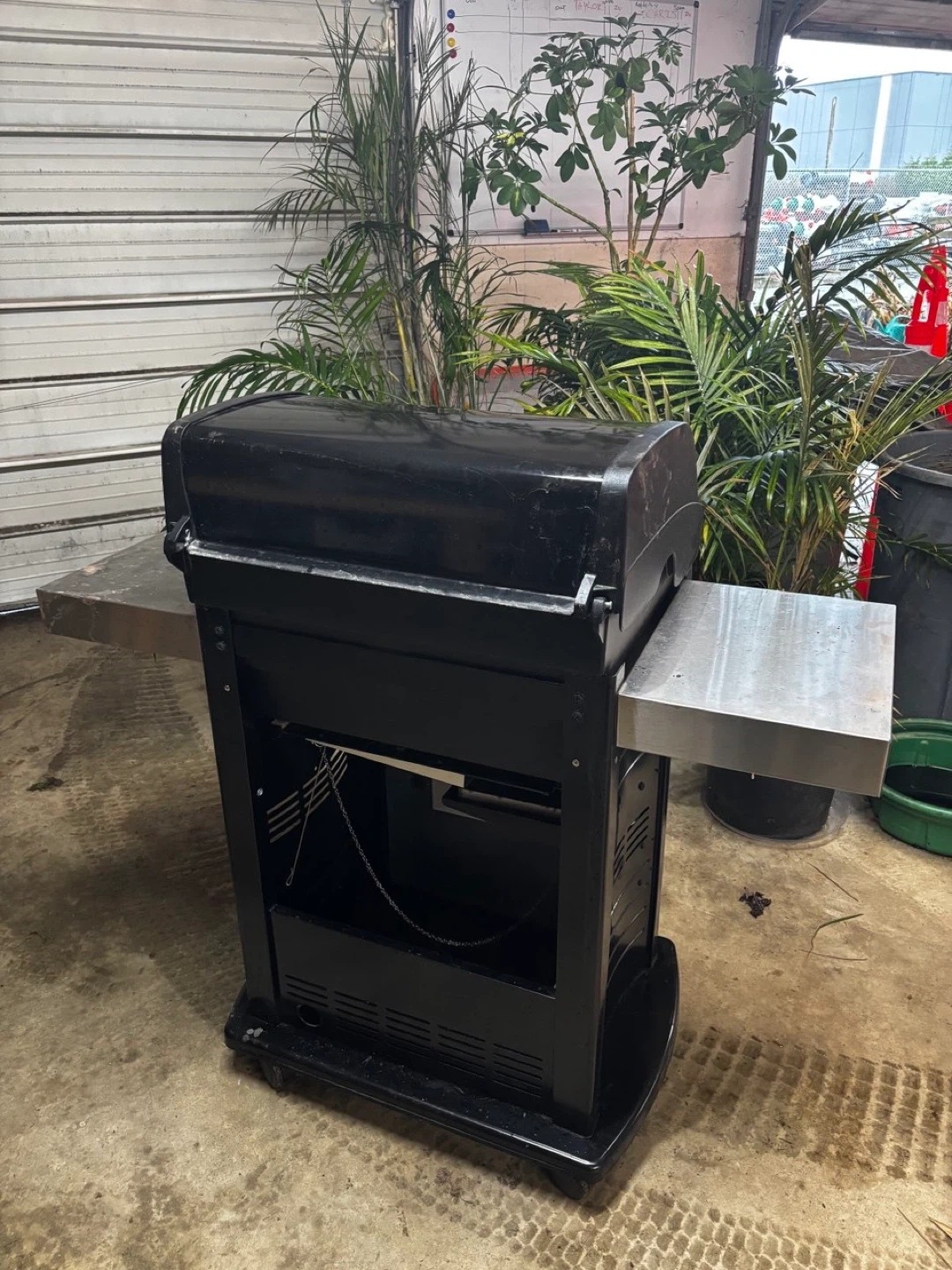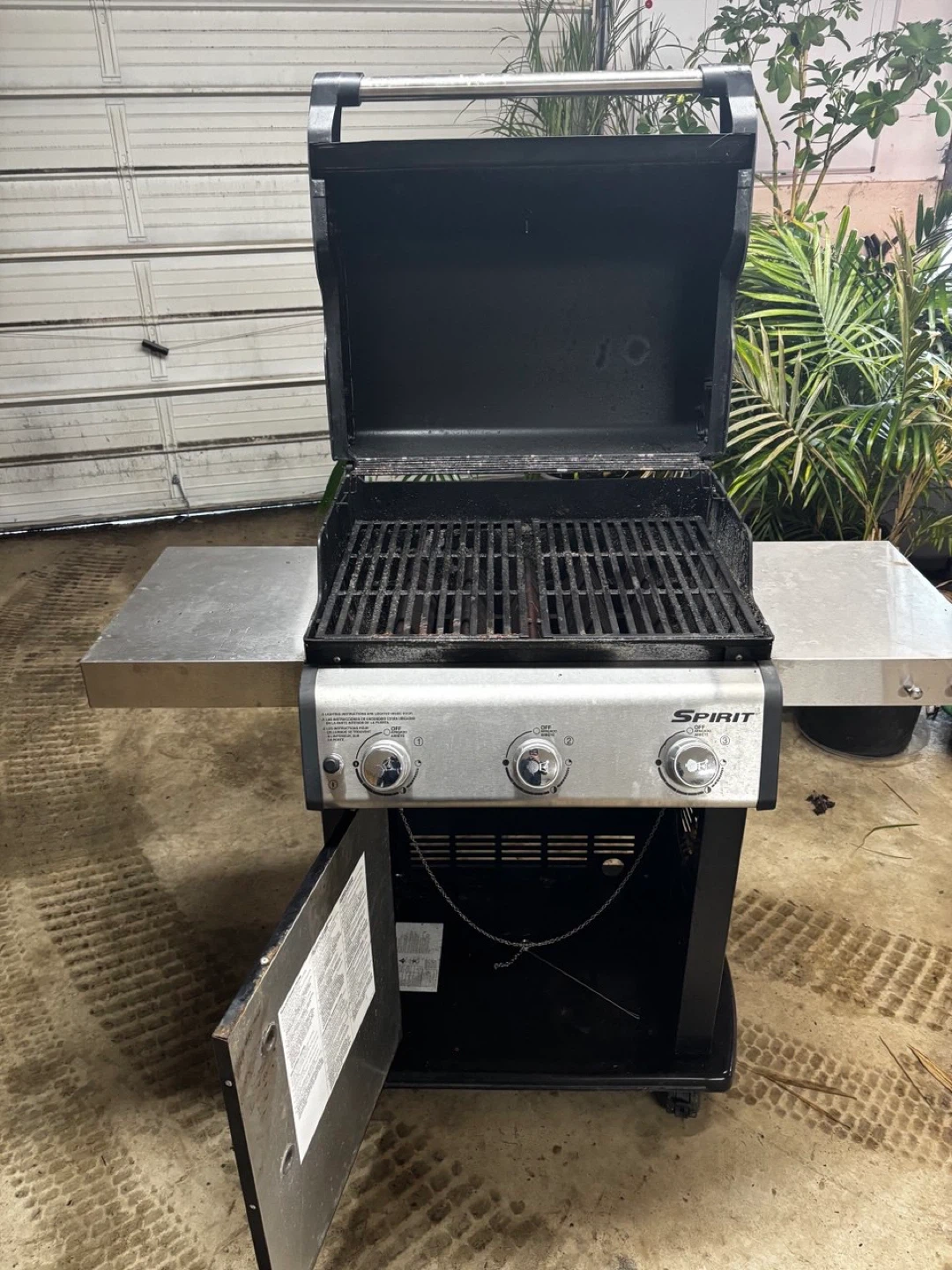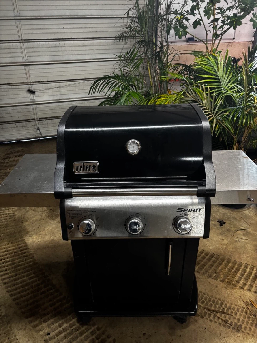 This is a Weber Spirit E-315 NG propane grill, perfect for outdoor cooking. It features three burners and a thermometer on the lid. The side tables offer extra prep space.