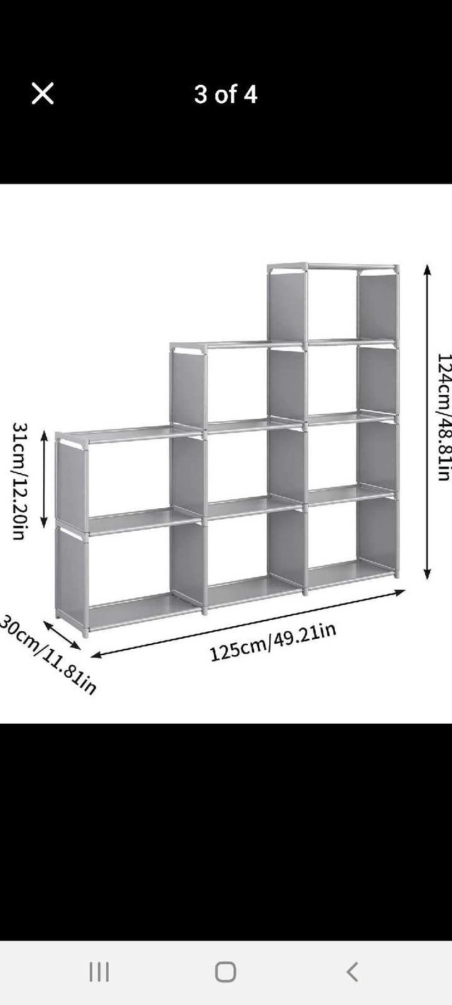 This grey 9-cube organizer is perfect for adding extra storage to any room. Each cube measures approximately 11.8 x 12.2 x 11.8 inches (30 x 31 x 30 cm), and the whole unit is about 49.2 inches (125 cm) wide and 48.8 inches (124 cm) tall. It's in good condition and has been super handy, but I'm redecorating and no longer need it. Colour: Grey. Cube Size: 11.8 x 12.2 x 11.8 inches (30 x 31 x 30 cm). Overall Dimensions: 49.2 x 11.8 x 48.8 inches (125 x 30 x 124 cm). Number of Cubes: 9. Cash accepted.