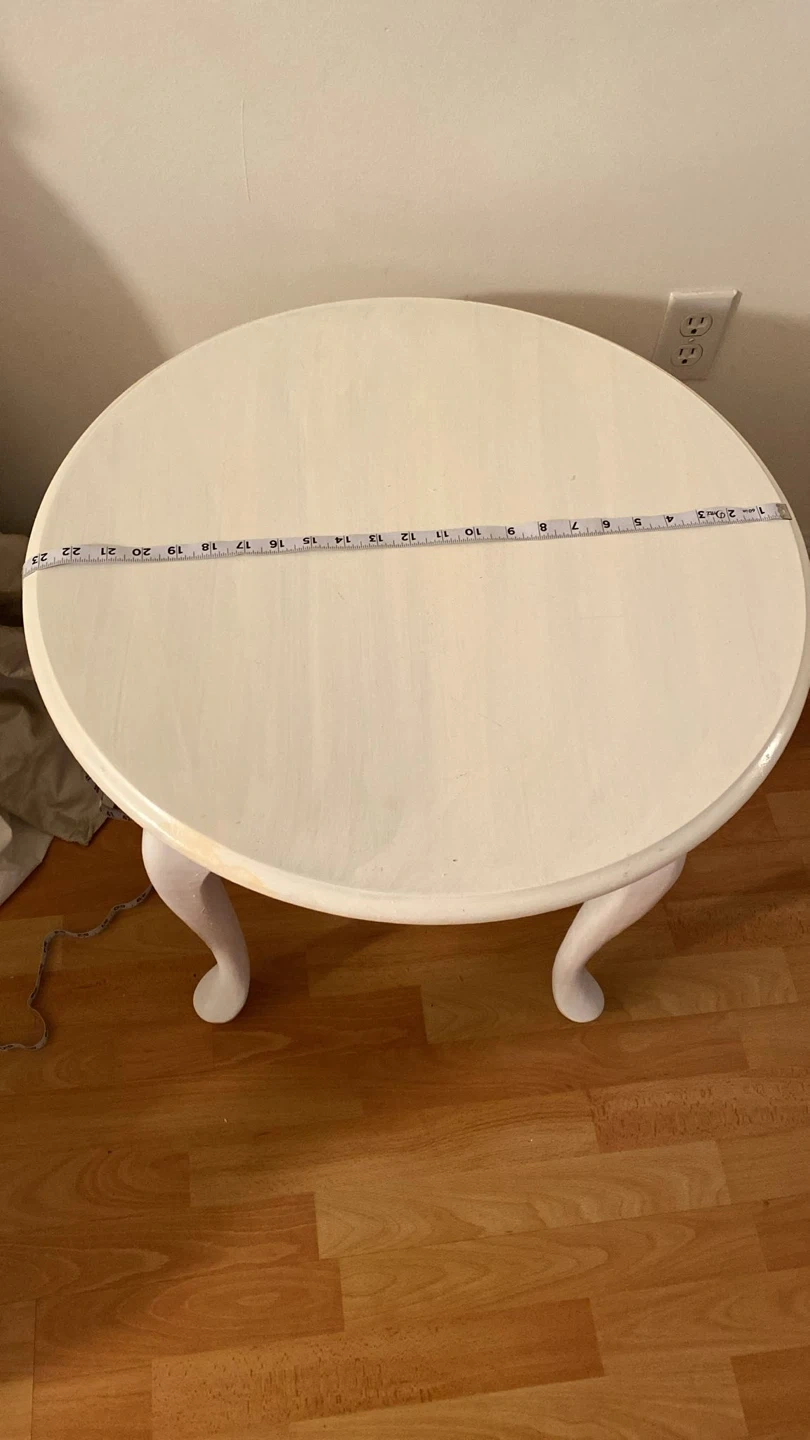 Selling a cute round side table! It's white and in great shape. The table top measures approximately 23 inches in diameter and the height is about 22 inches
