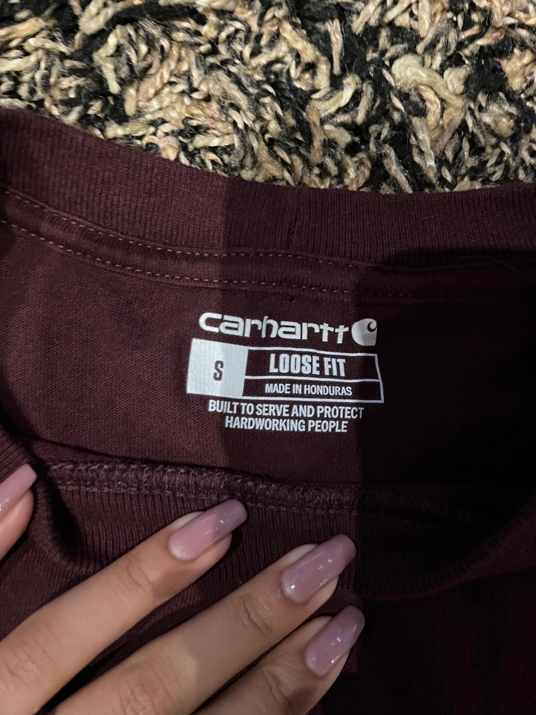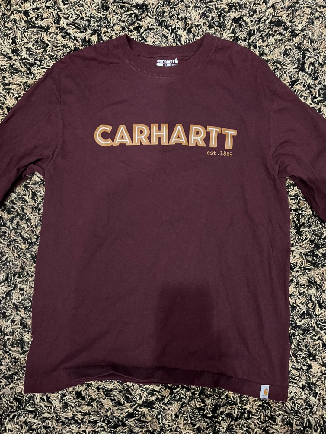 Selling a Carhartt long sleeve shirt in a nice burgundy colour! It's a size small and has a loose fit. The shirt has the Carhartt logo across the chest. In good condition!