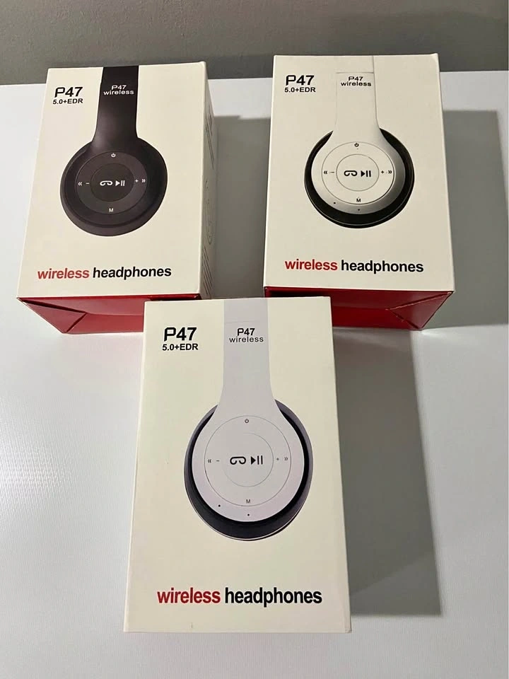 Brand new P47 wireless headphones, still in boxes. Includes 1 black and 2 white units.