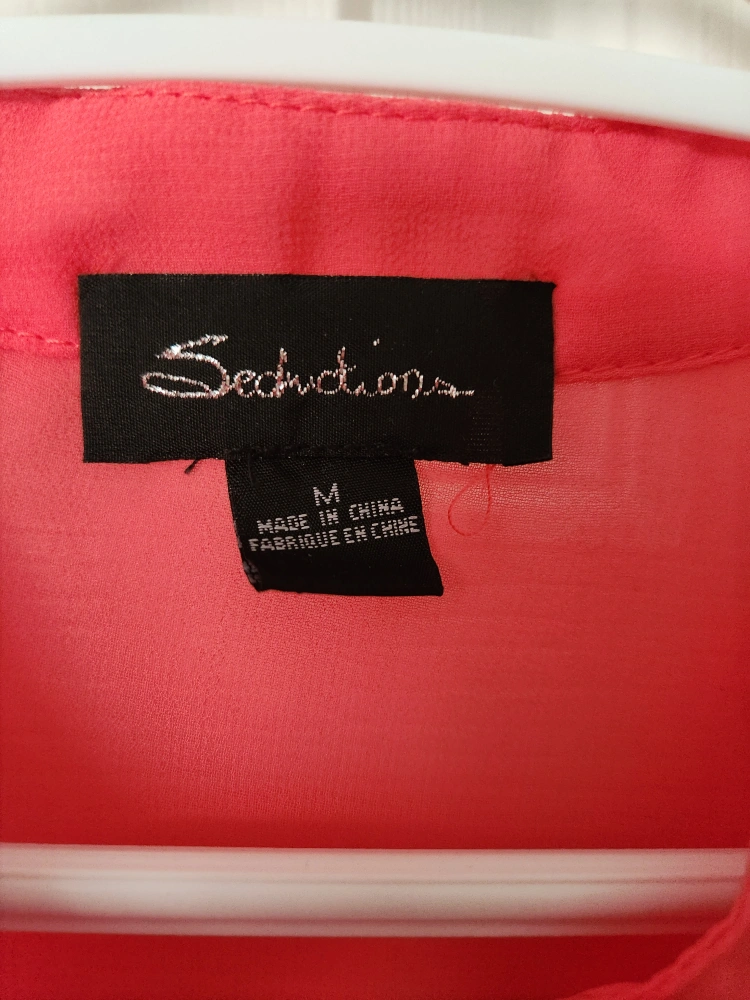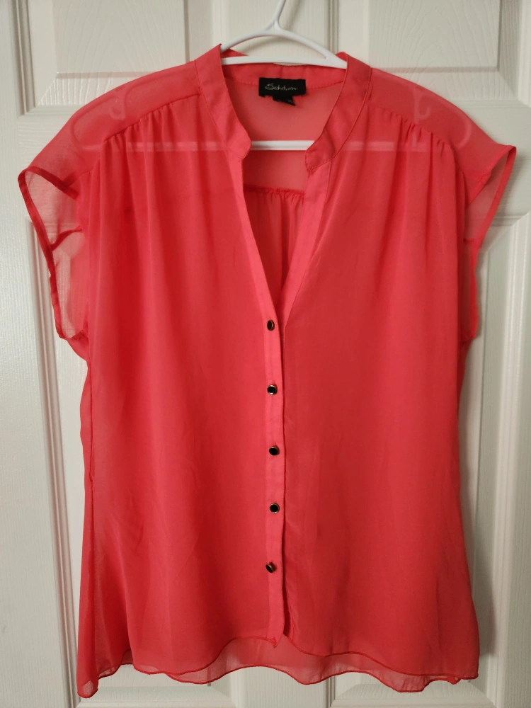 A beautiful coral-colored blouse from Seductions in size medium. It has a sheer, flowy feel with button details. Perfect for adding a pop of colour to your wardrobe!