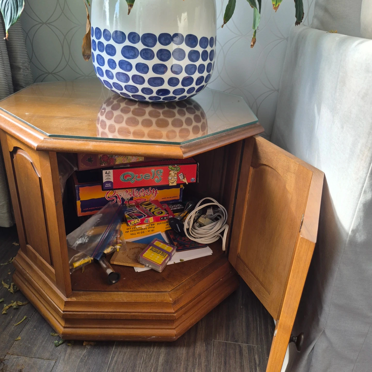 This wooden end table features a unique hexagonal shape and a glass top. It has a single cabinet door for storage. This table would be great for holding a lamp or decor items next to a couch or chair.